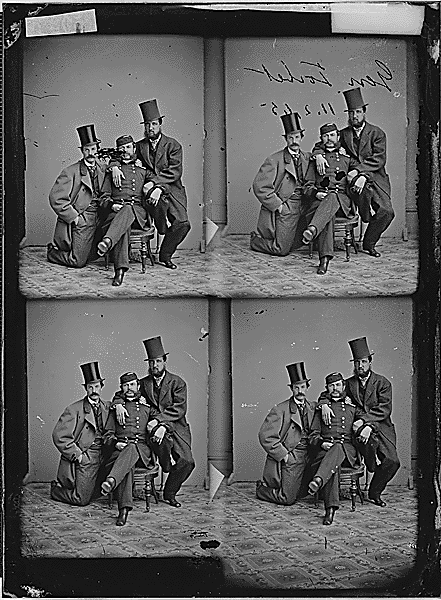 The hat in the middle appears to be a Victorian era Forage Cap worn by officers on campaign, modeled on the British Army. Common enough practice among American officers at the time… but please, some clarification on that would be marvellous.