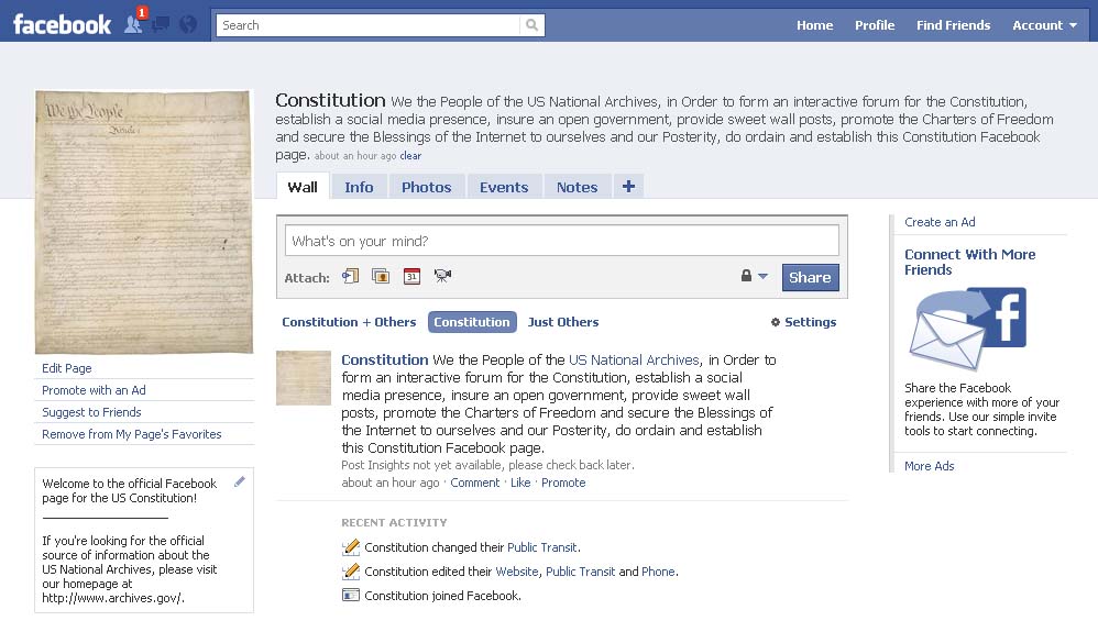 While the Constitution may not update it’s own writing too often (the last time was in 1992), it does update its own Facebook page. So why not head on over and see what’s on the Constitution’s mind? The Constitution will be keeping tabs on the 1787 Constitutional Convention up until September 17 on the Notes tab. Have a look and check back often to see what’s new with our nation’s founding document.