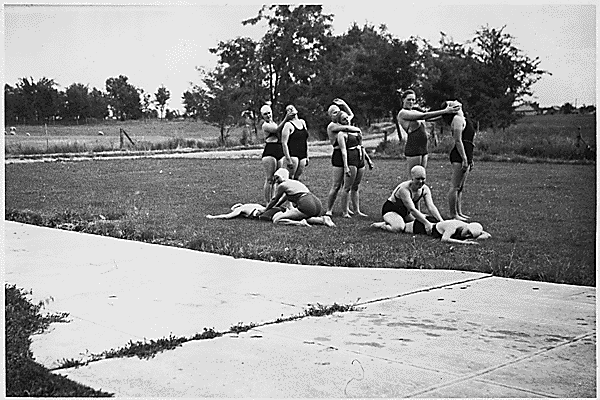 Well, it’s not synchronized swimming on land, it’s legitimate life saver training in Idaho, circa 1936. You can view the ARC entry for this photo (a record of the FDR Presidential Library) by clicking on the picture at left. Andrea still has a great point: they do look a bit like the Village People. That caption won her 30% off at the eStore and our judge’s gratitude for a job well done.