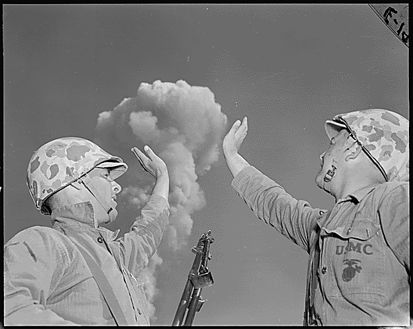 The actual caption is just as unsettling, however. These two marines are enjoying themselves after a nearby atomic blast. As the caption reads: “The atomic cloud formed by the detonation seems close enough to touch, and tension gone, Poth and Wilson do a little clowning for the camera.” Click the photo for the full scoop.