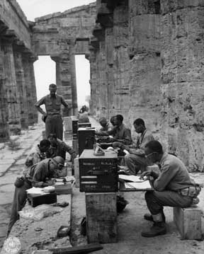 What struck me most about the photograph was the combination of the military and the religious element in it—soldiers in a shrine, albeit an ancient one—and the resulting peaceful atmosphere of the image. The soldiers are intently at work and look almost like school students during study hall. The massive Dorian columns of the Greek temple seem almost protective of their quiet activity.