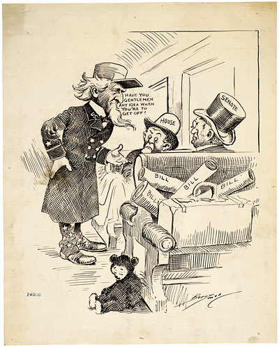 History repeats itself, and Berryman might have recognized another recent political situation as very familiar! In this cartoon, Uncle Sam asks the House and Senate when they will adjourn so members could return home to campaign.