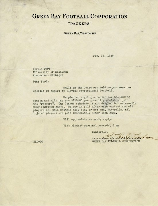 But in 1935, playing football wasn’t the glitzy well-funded enterprise it is today. That’s the year the Green Bay Packers went looking for a center, and found future President Gerald Ford. They offered President Ford $110 bucks a game. Over the course of a season—14 games—that means Ford would’ve squirreled away $1,540, about $24,000 bucks in 2011 dollars, if he had accepted the draft deal.