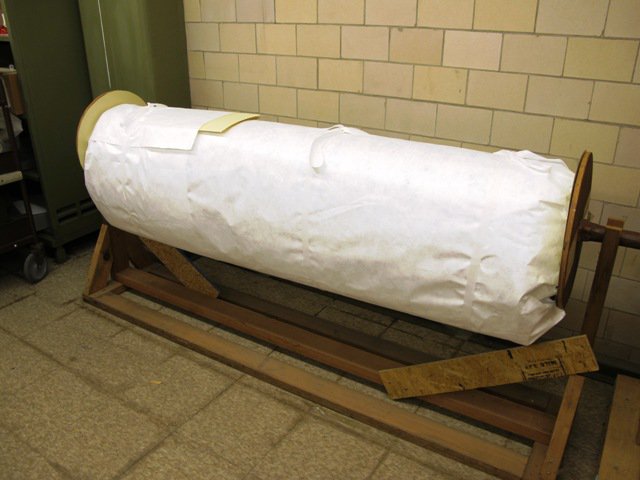 As an official document of the U.S. Senate, it eventually came down the street to the National Archives. It had been stored in a safe place, but over the years, the exposed outer paper of the roll attracted dust and dirt. The conservator working on this job gently removed the dirt from the exposed areas and stabilized the roll by wrapping it in Tyvek.