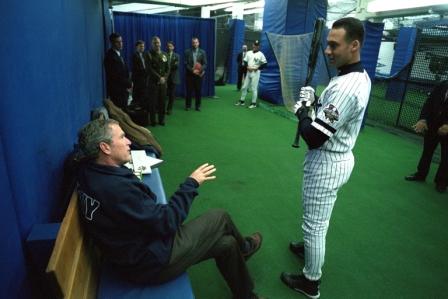 The President recognized the importance of the moment, and if you saw that game, you will recall the thunderous applause he received as he walked to the mound—especially after he threw a strike! President Bush often tells the story, including in his book Decision Points, about the exchange he had with Yankees shortstop Derek Jeter as he prepared to walk onto the field. Jeter told him that he should pitch from the mound, not somewhere closer to the plate. If the President stood closer to the plate, the crowd would boo. The President accepted that advice and was about ready to step out when Jeter added that, if he didn’t get the pitch to the catcher from the mound, then the crowd would boo. With those words ringing in his ears, the President made his way onto the field, now even more nervous about the pitch. Thankfully he was calm enough and retained his baseball skills (which run in the Bush family) so that he not only got the pitch to the catcher, but made it a strike to boot. I think he was determined to do it right.
