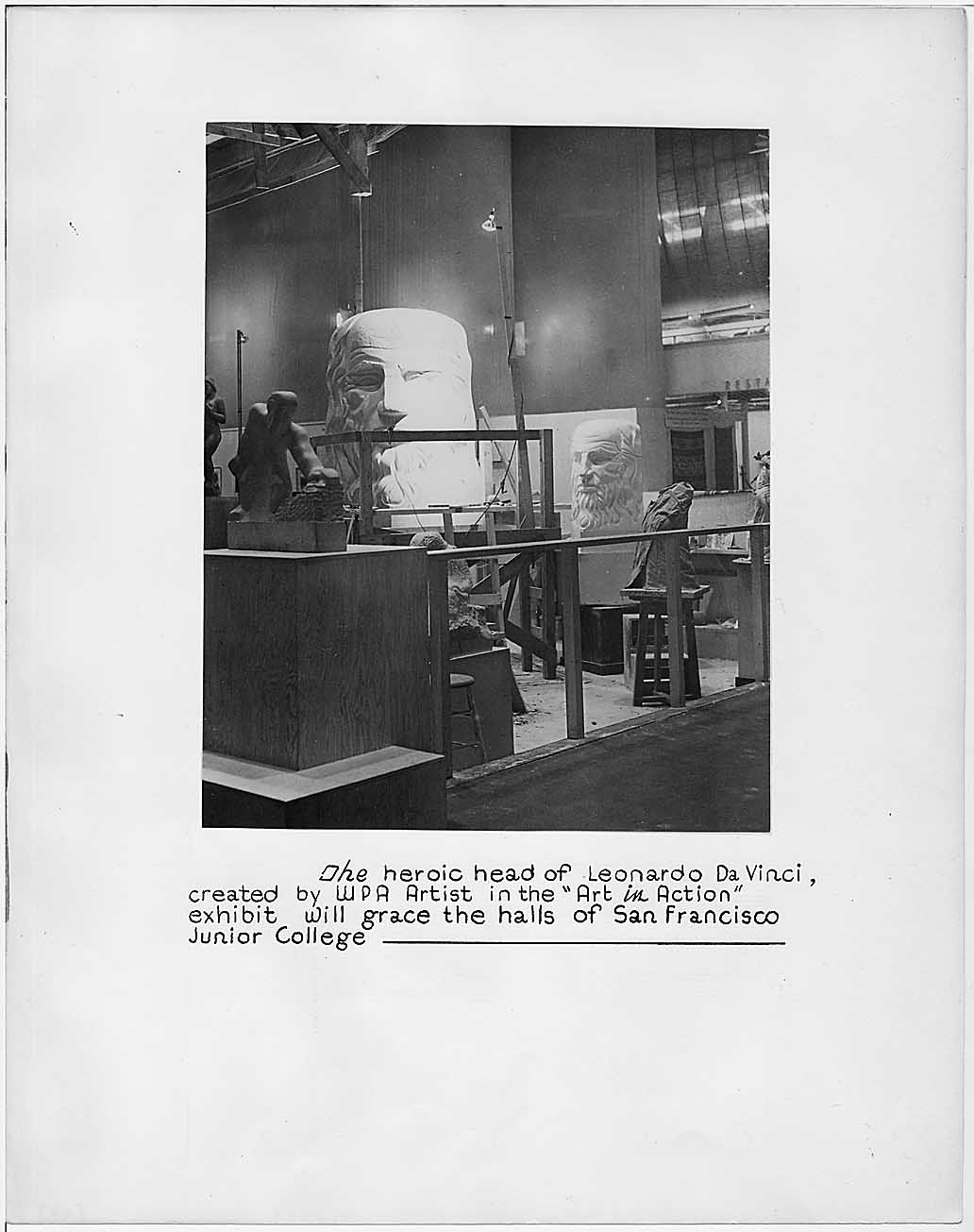 At one booth, a demonstrator shows how scraps can be recycled into useful objects (this is now called “up-cycling” by sites like Etsy). Another photograph shows an artist painting while a crowd watches him behind a fence. And the well-known artist Diego Rivera is casually tossed into the report—there’s a photograph of him working on a mural. A giant head of Leonardo da Vinci is being sculpted for the San Franciso Junior College. It’s interesting to see how the art being made is for the public, both as part of the exhibit and as projects for later display somewhere out in public. This isn’t art for museums or private collections, but art for everyone.