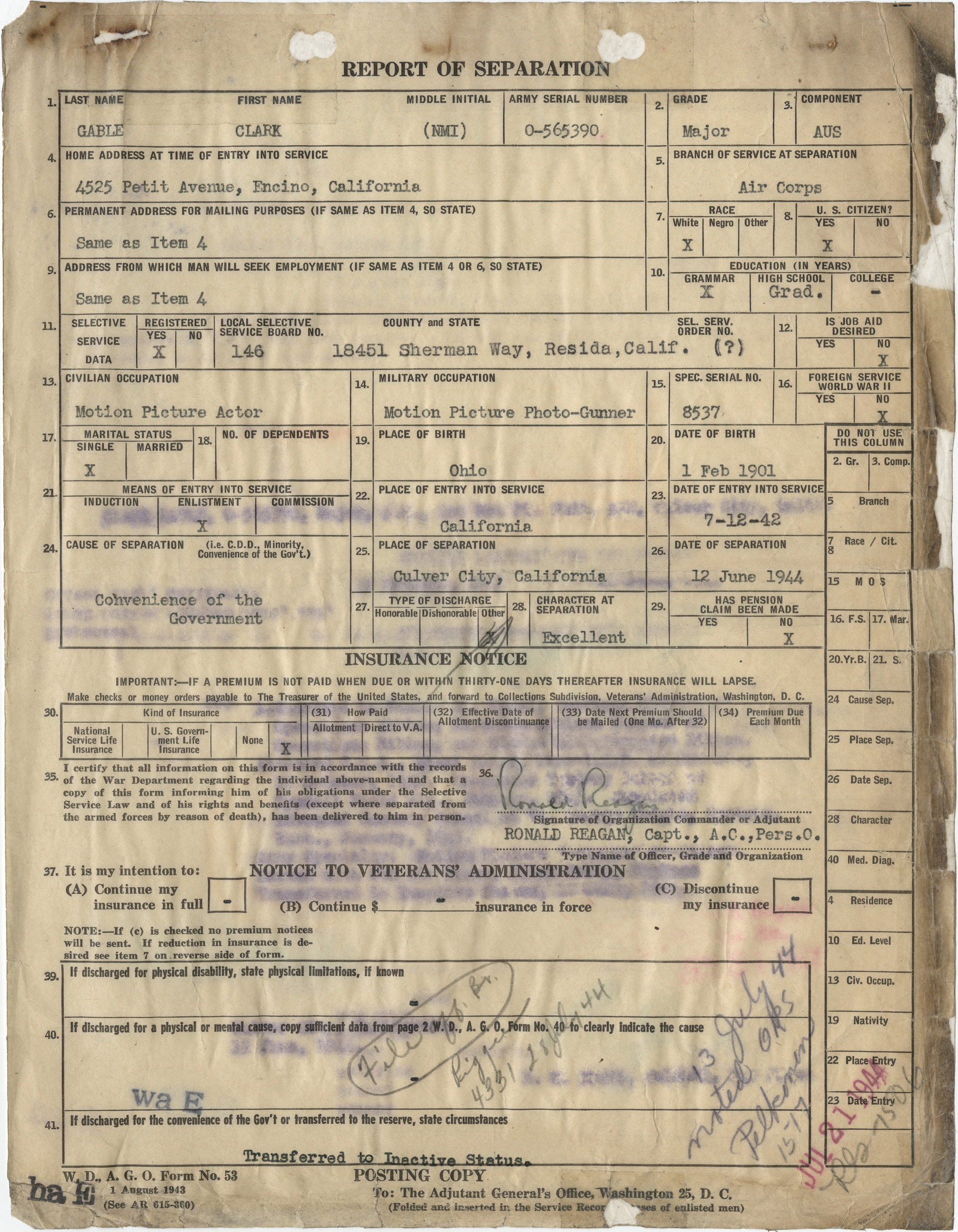 Eventually, Gable requested a discharge. Like all citizens who serve in the U.S. military, his service records are part of the permanent holdings at the National Personnel Records Center. But Gable’s separation papers have a special twist: they were signed by Capt. Ronald Reagan.