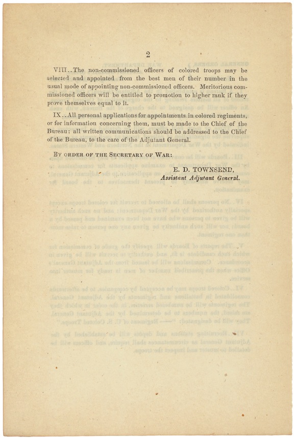 You can read more about the beginning of the USCT in “Living with the Hydra” by Walter B. Hill, Jr., which was published in the Winter 2000 edition of Prologue. This story also comes from the National Archives online exhibit, “Our Documents,” featuring General Order 143.