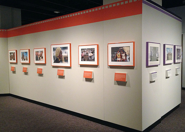 The font’s legibility was also important. Because there are so many photographs and labels in the exhibit, the designers wanted something clean that wouldn’t distract from the photos. Helvetica is a large family of typefaces, so it allowed for a clear hierarchy of headings and subheadings. To incorporate a more playful feel while keeping it simple, the design team used a rounded condensed version of Helvetica as the largest subheading font. The exhibit also includes a distinctive header font called Gala, which is “funkier” than Helvetica and gives the exhibit more personality.
