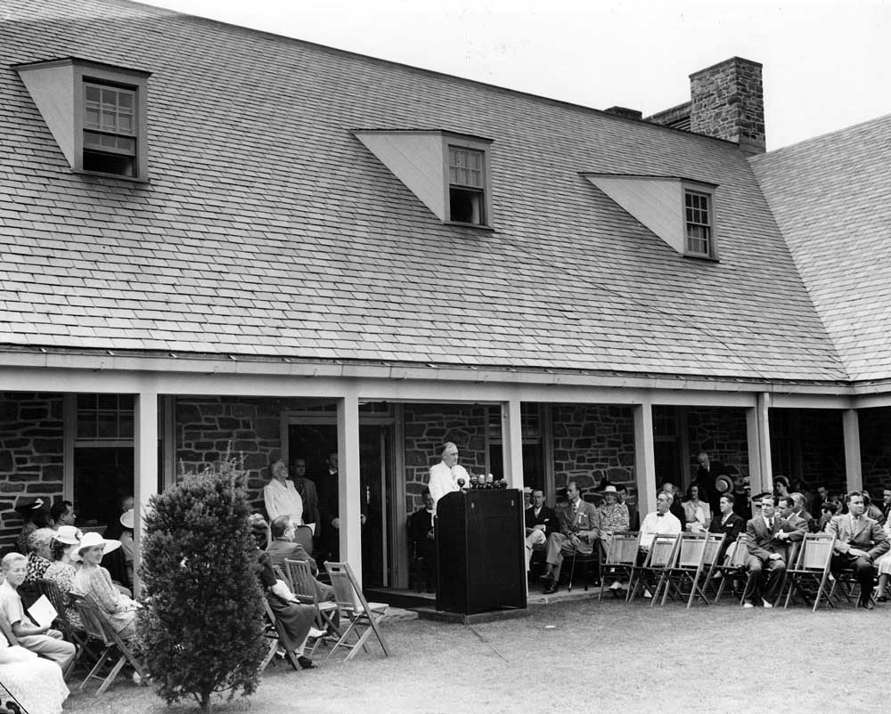 The first Presidential Library and Museum was conceived and built under President Franklin D. Roosevelt’s direction from 1939 to 1940 in Hyde Park, NY. The official FDR Library dedication was a small, quiet affair, with close friends and family attending the ceremony. Over the years, the ceremonies have grown larger, and dedications have become notable for the atmosphere of nonpartisan goodwill and respect among former Presidents.