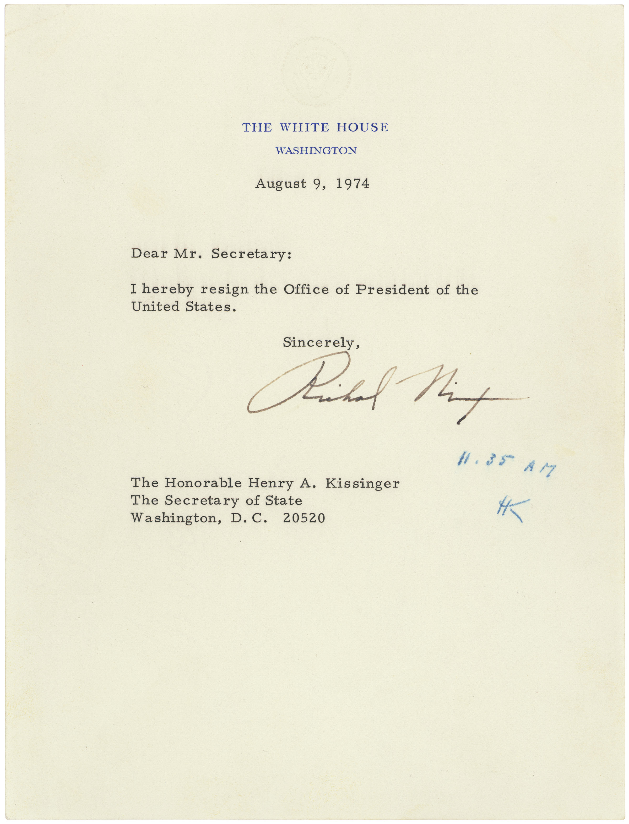 The next day, on August 9, 1974, President Nixon sent his resignation letter to Secretary of State Henry A. Kissinger.