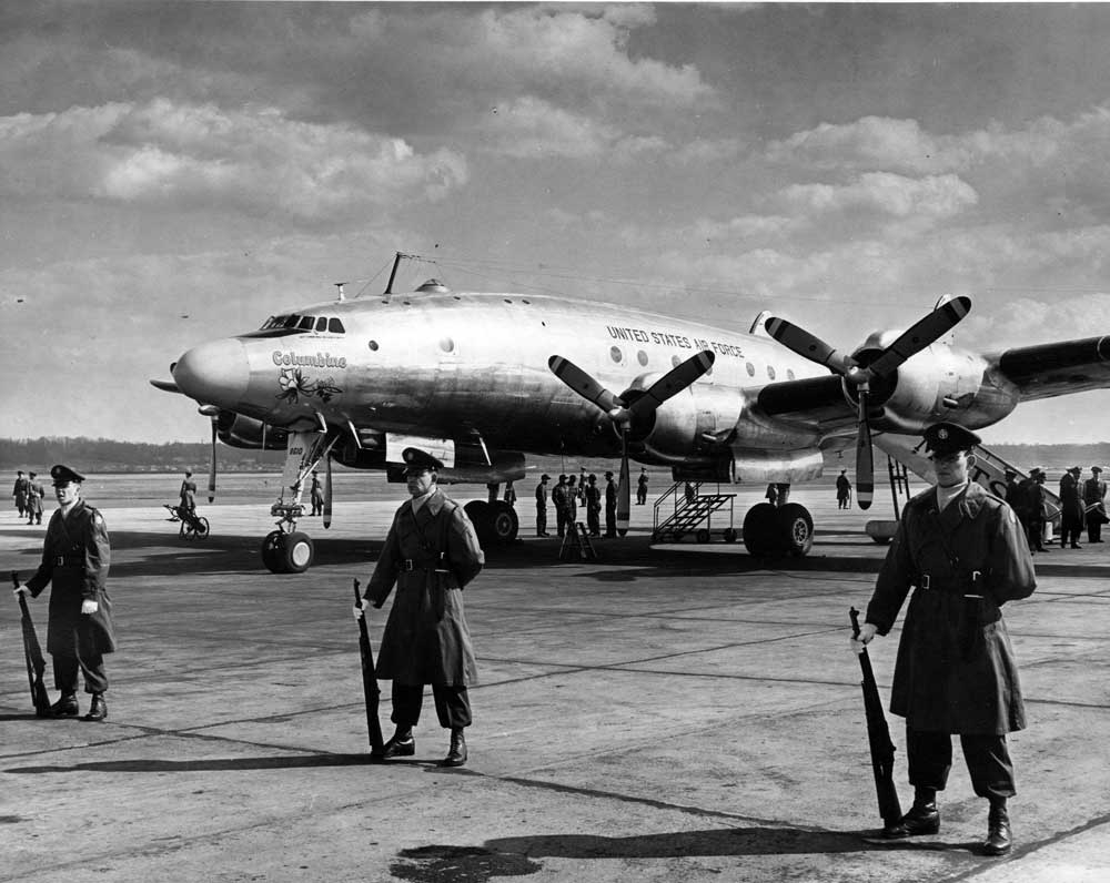 In 1947, a DC-6 plane known as Independence took the place of the Sacred Cow, and with it came upgraded technology such as a radio typewriter and a pressurized cabin, which allowed for high-altitude flying without the use of oxygen masks. The Independence — named for Truman’s hometown in Missouri — featured an eagle painted on the nose, and an interior with a seating capacity of 24 (12 for sleeping).