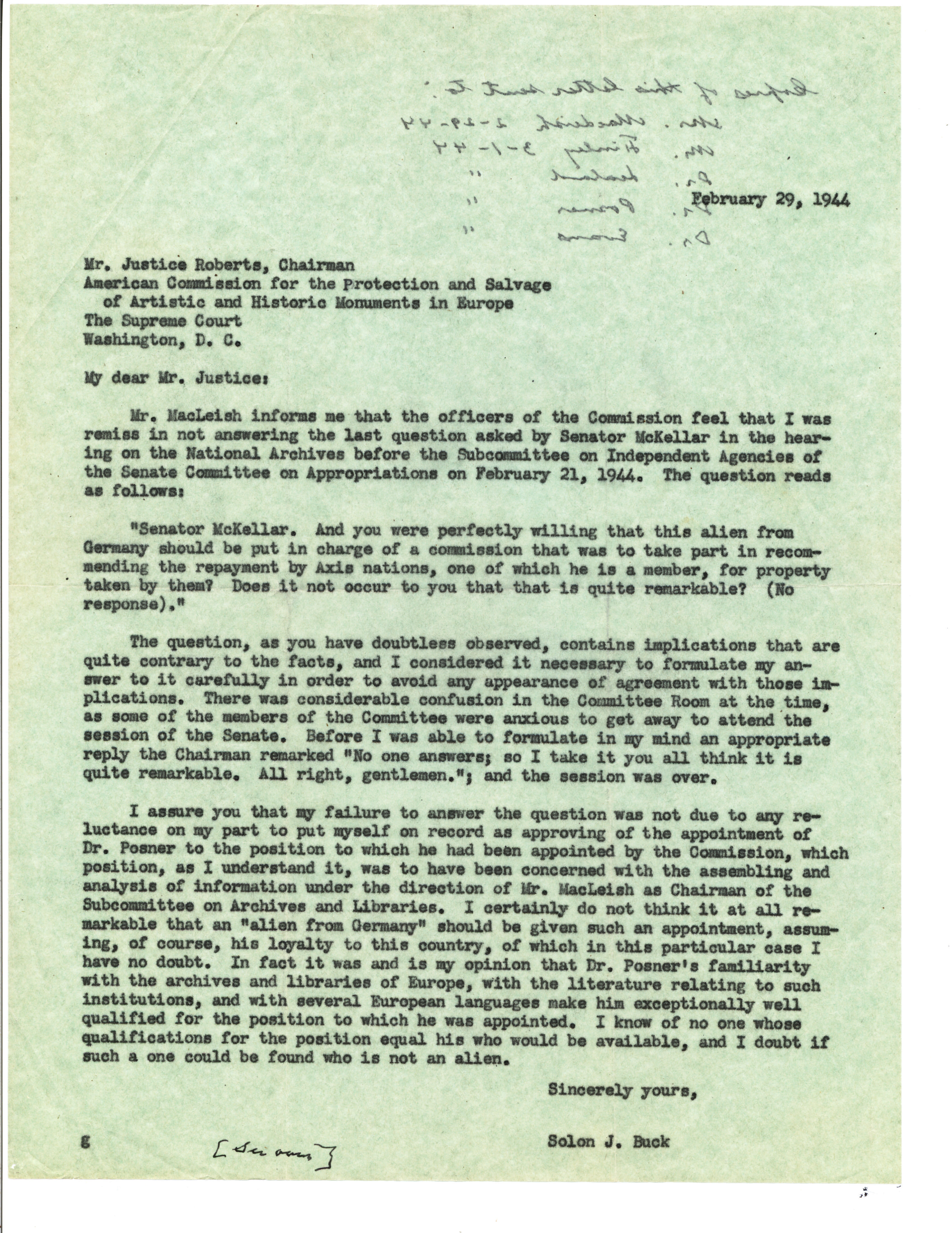 Buck appeared before the Subcommittee again the next week and was later visited by an investigator of the Civil Service Commission. The suspicions deeply troubled Buck, leading him to resign from the Subcommittee on Archives and Libraries of the American Commission for the Protection and Salvage of Artistic and Historic Monuments in Europe. Posner also resigned from his recently appointed position as secretary to the Commission’s Committee on Books and Manuscripts, pending a thorough investigation of his “activities and loyalty.”