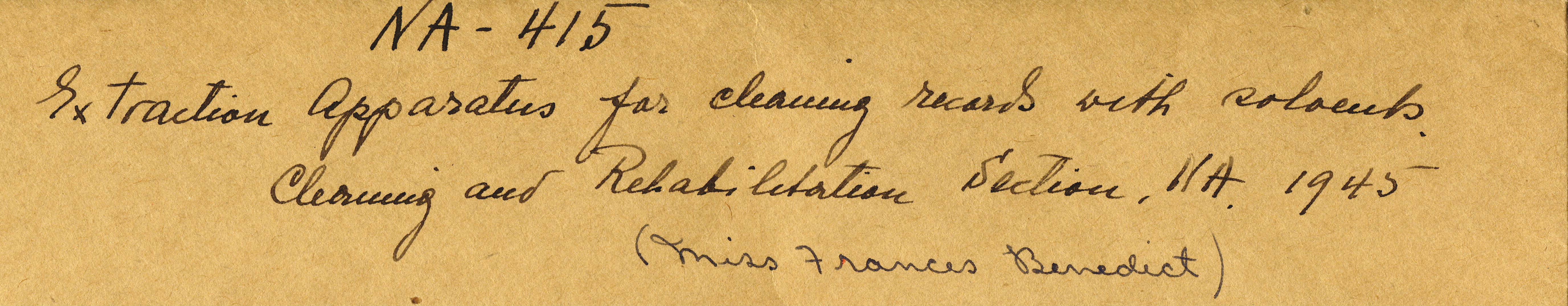 Frances Benedict worked in the Division of Repair and Preservation (later the Cleaning and Rehabilitation Branch). She appears in the Archives telephone directories from 1944 through 1949. Thank goodness someone thought to write down her name on this caption!