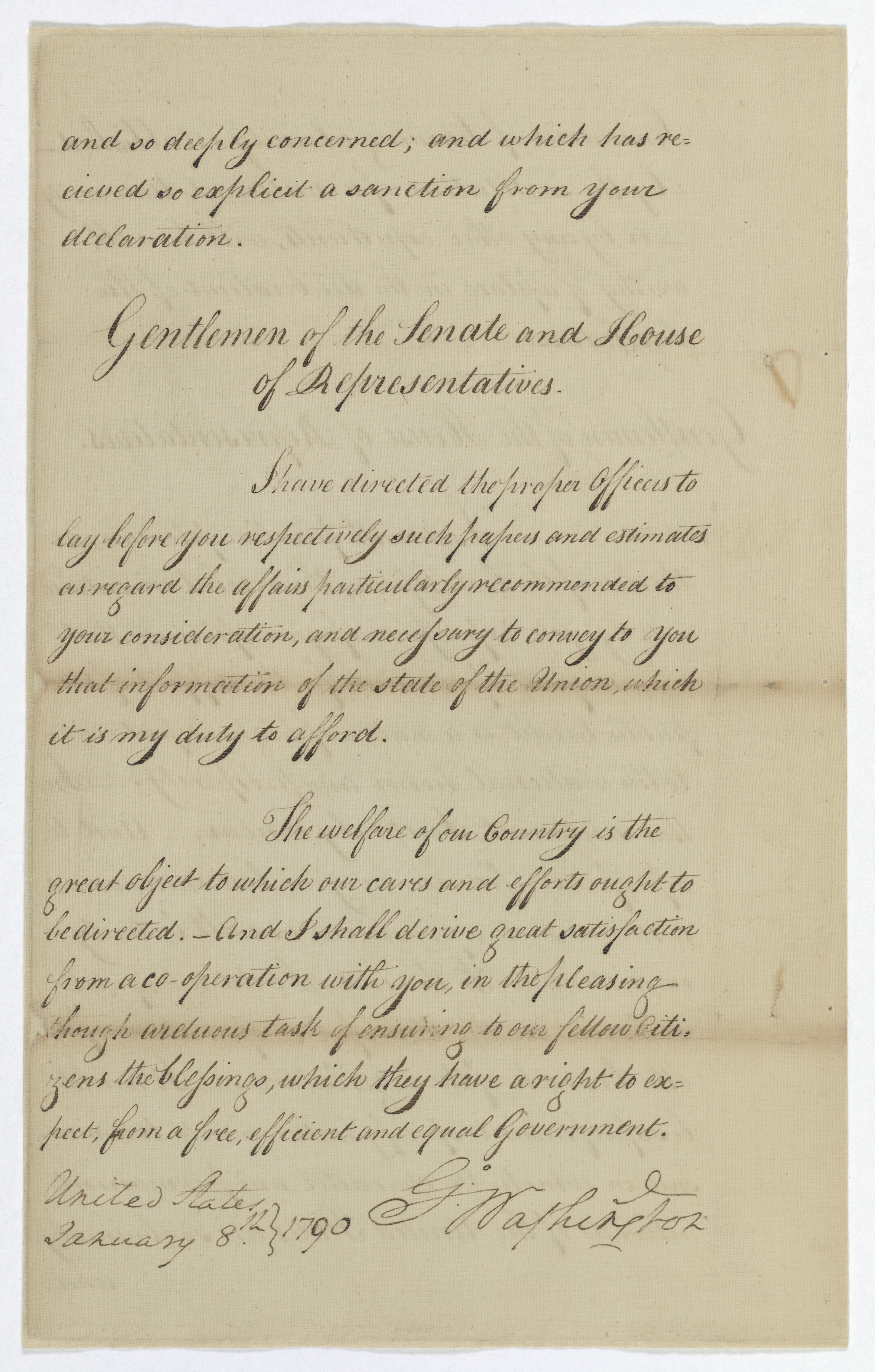 On January 8, 1790, President George Washington delivered a speech at Federal Hall in New York City. This speech, called his first annual message to Congress (which we now refer to as the State of the Union), was short—in fact, it remains the shortest one ever.