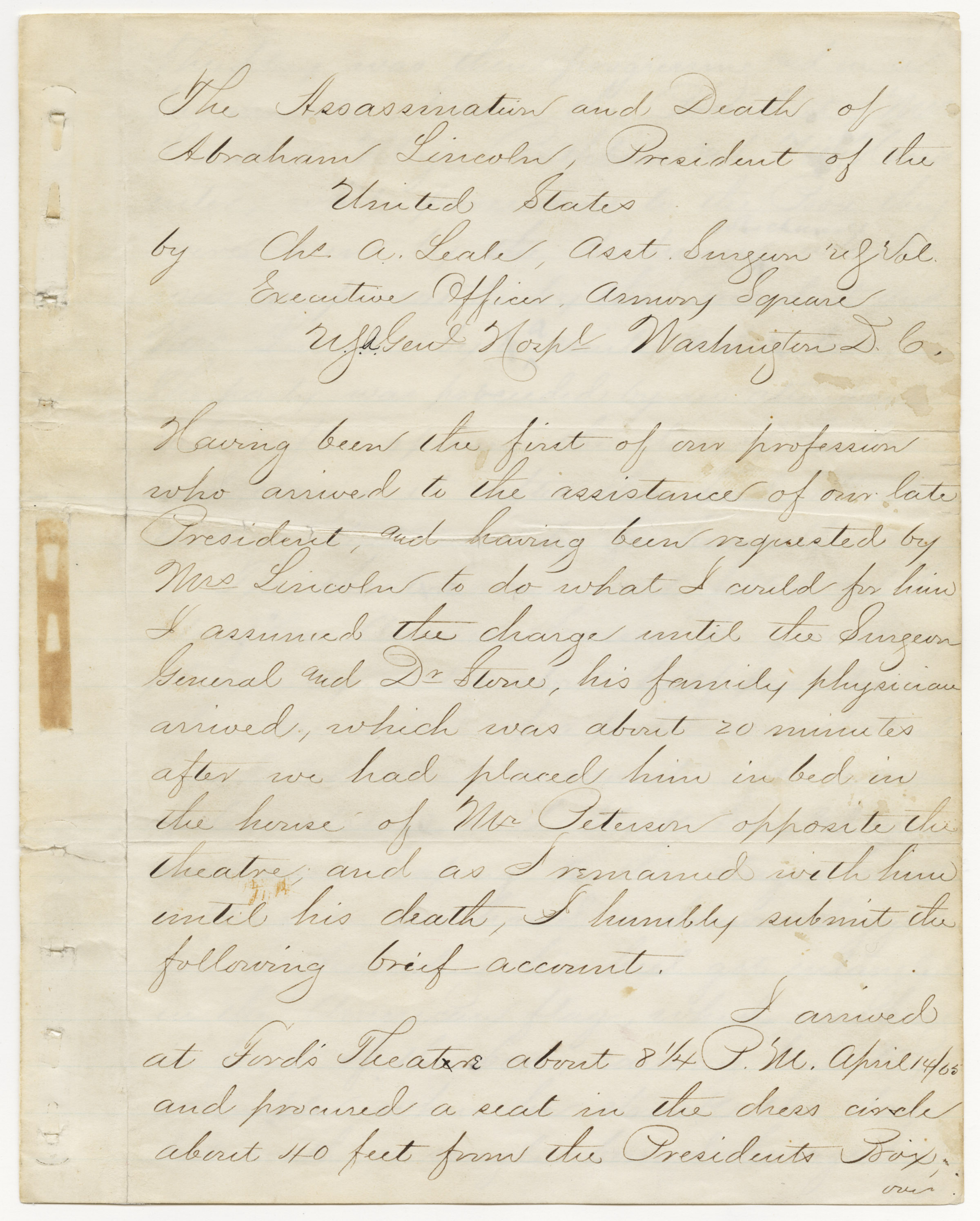 Leale’s report to the Surgeon General of the United States concerning the Lincoln assassination is now on display at the National Archives in Washington, DC.