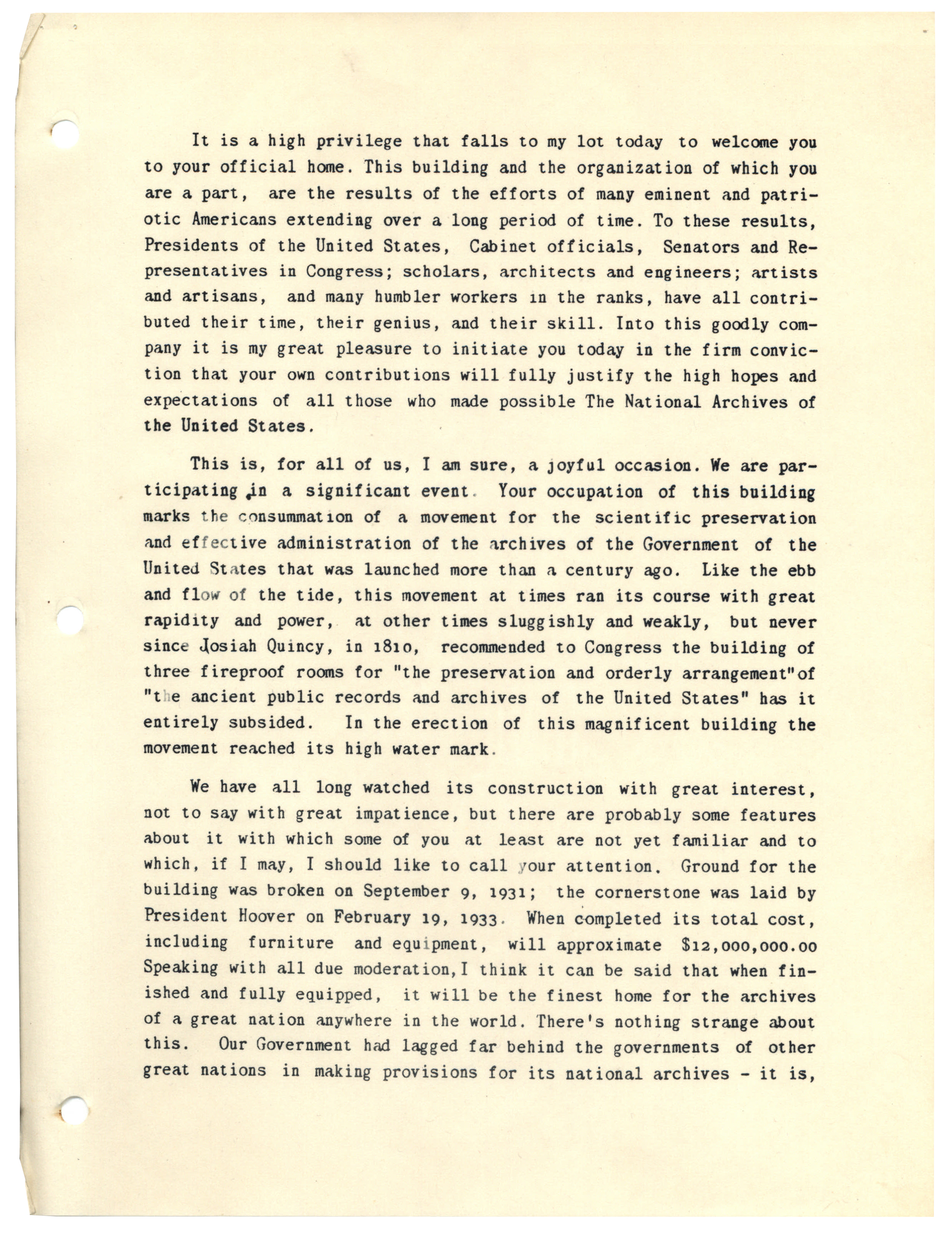 When he took office, the National Archives Building had not yet been completed, a full staff had not been assembled or trained, and he had to develop procedures to acquire, archive, and preserve 150 years of Federal records that were currently stored in unsuitable conditions in buildings around the country.