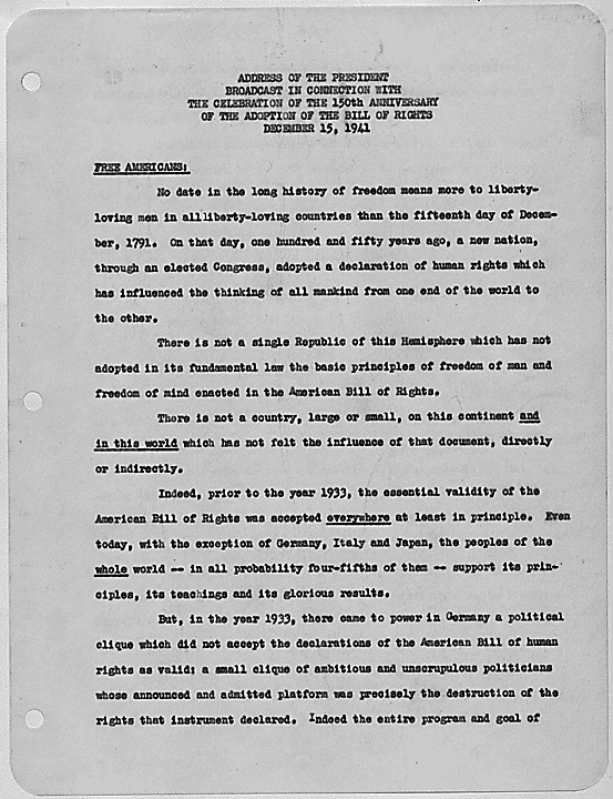 Later, in his radio address on Bill of Rights Day—a week after we entered World War II—Roosevelt applauded liberty loving nations who support the rights outlined our charter, and denounced counties like Nazi Germany for its destruction of those very rights.