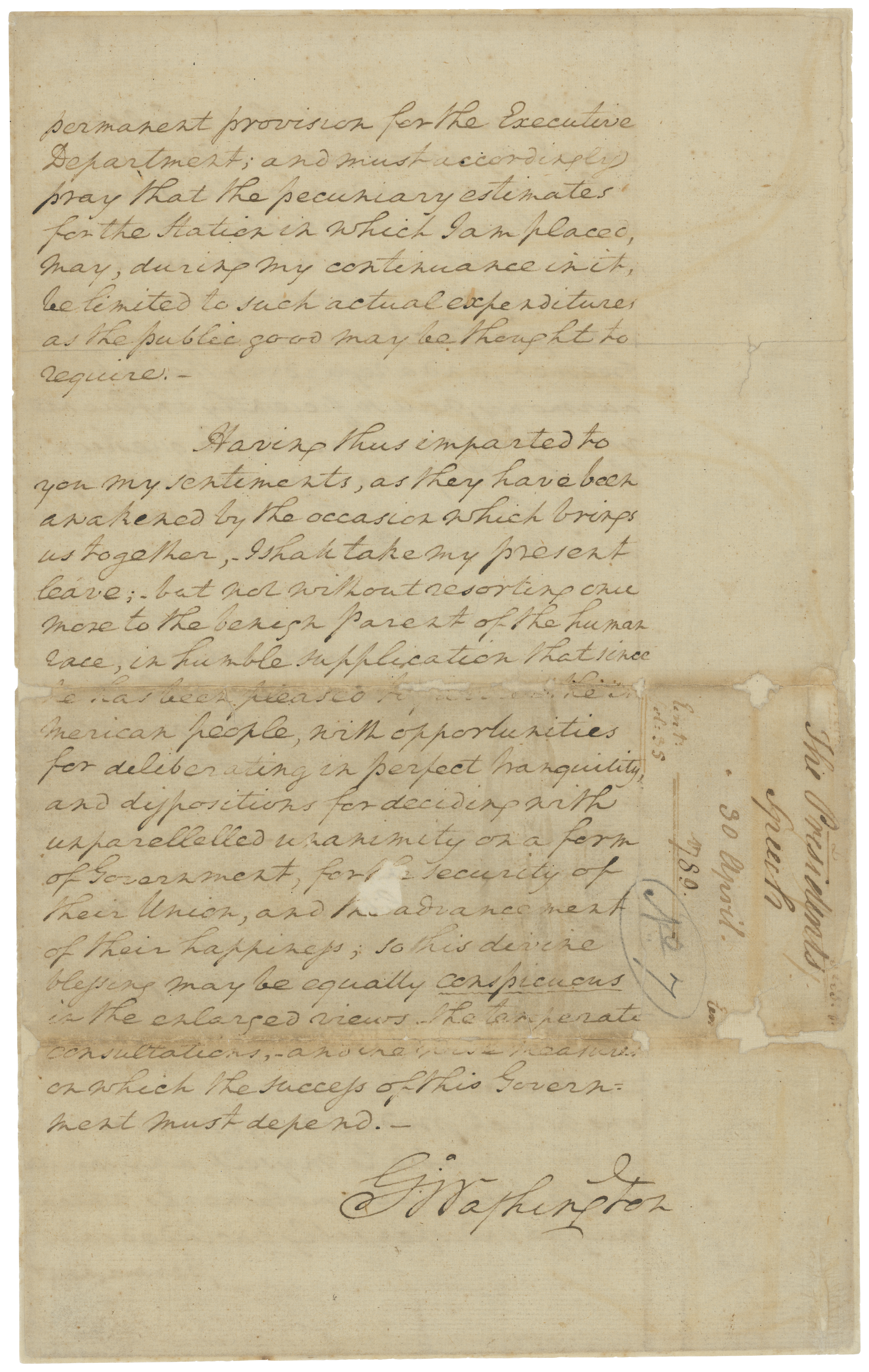 In this handwritten address to Congress, he humbly noted the power of the nation’s call to serve as President and the shared responsibility of the President and Congress to preserve “the sacred fire of liberty” and a republican form of government. Washington’s address was later printed and distributed throughout the nation and around the world.