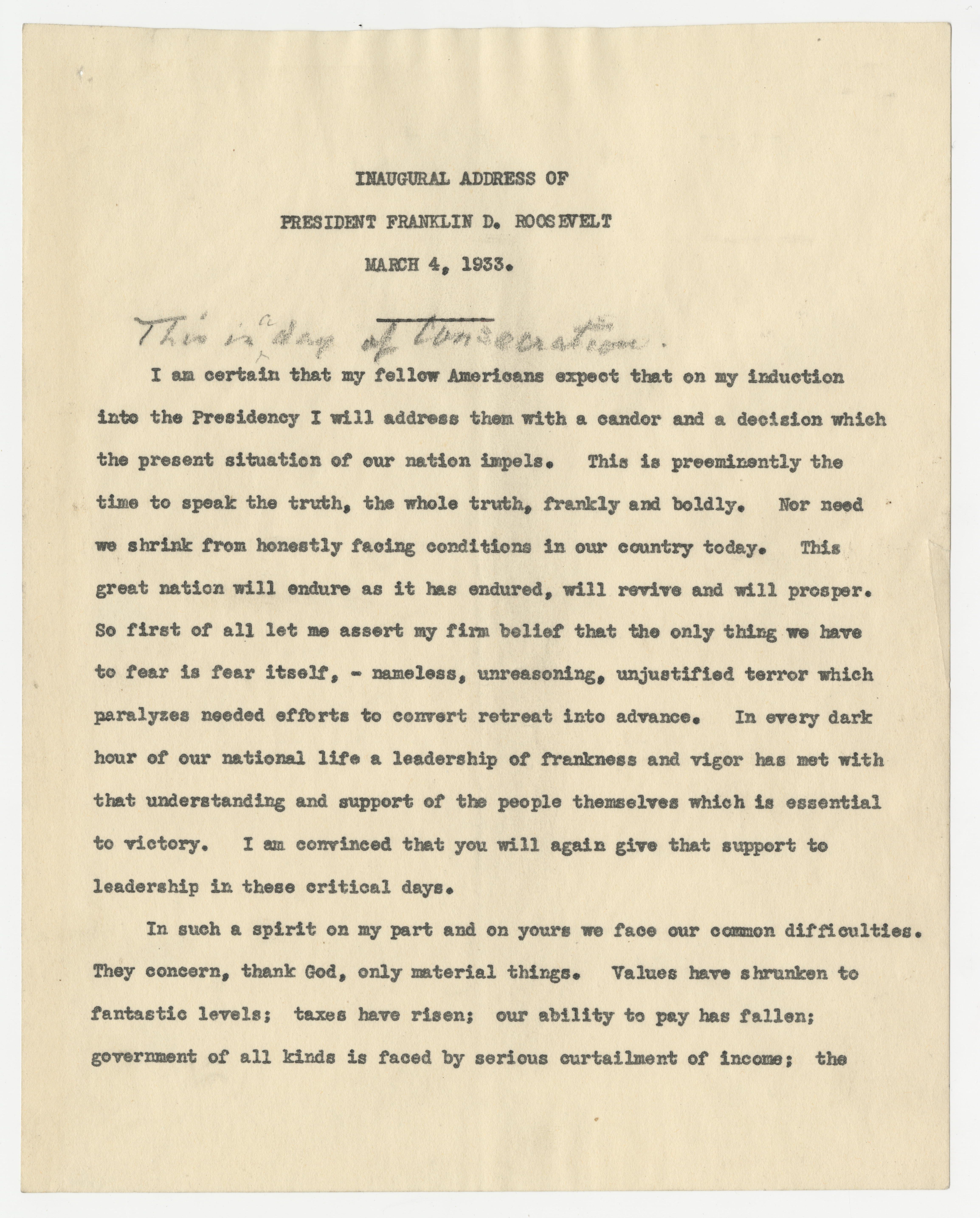 “This great Nation will endure as it has endured, will revive and will prosper. So, first of all, let me assert my firm belief that the only thing we have to fear is fear itself—nameless, unreasoning, unjustified terror which paralyzes needed efforts to convert retreat into advance”