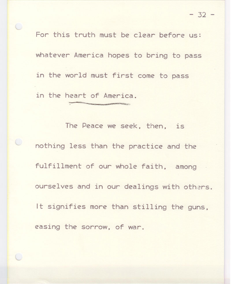 “The greatest honor history can bestow is the title of peacemaker. This honor now beckons America — the chance to help lead the world at last out of the valley of turmoil and onto that high ground of peace that man has dreamed of since the dawn of civilization.”