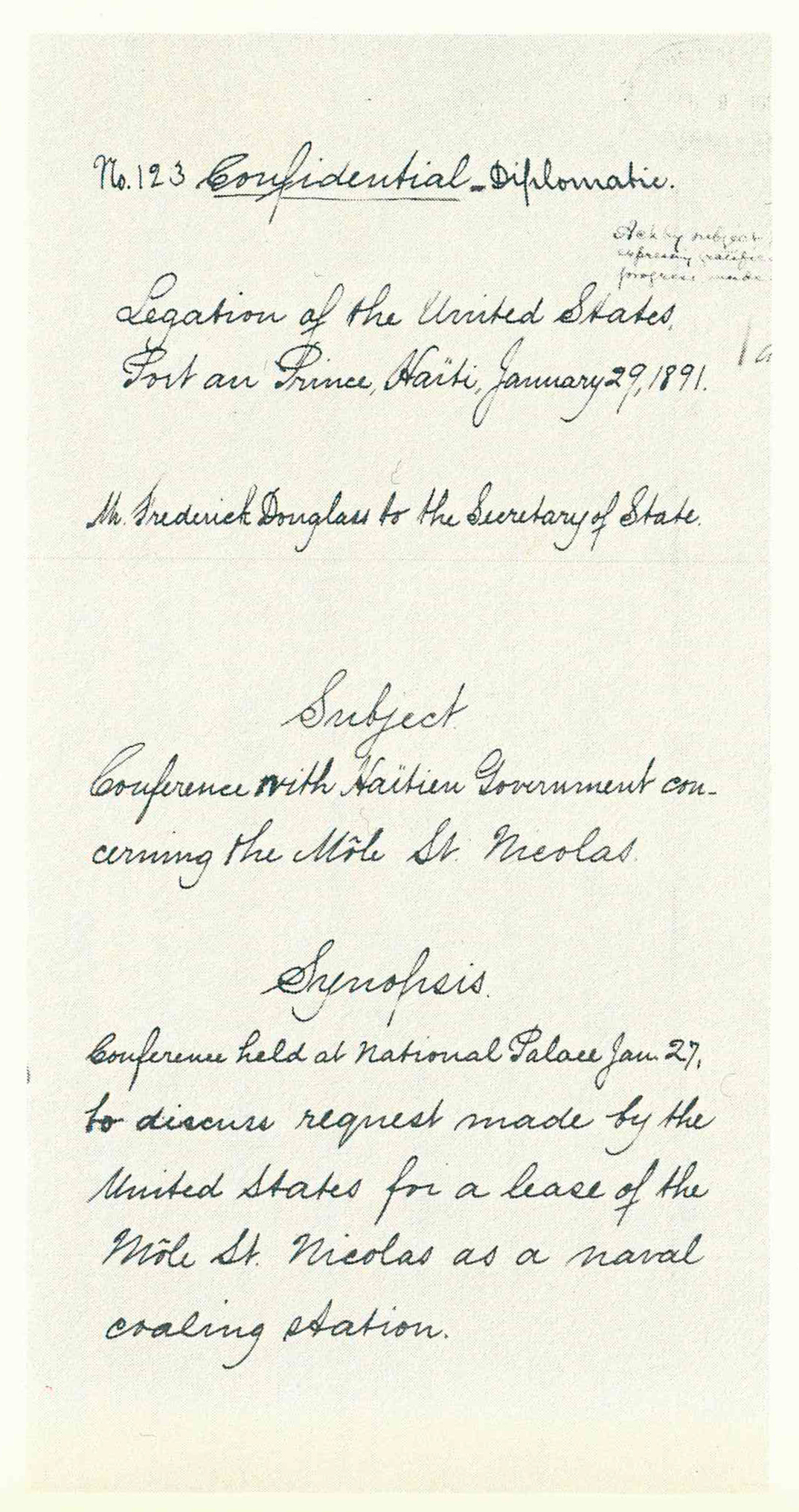 Dispatch from Frederick Douglass, Minister to Haiti, to Secretary of State James G. Blaine, January 29, 1891, which was reprinted in Afro-American History Sources for Research. (Records of the Department of State, National Archives)