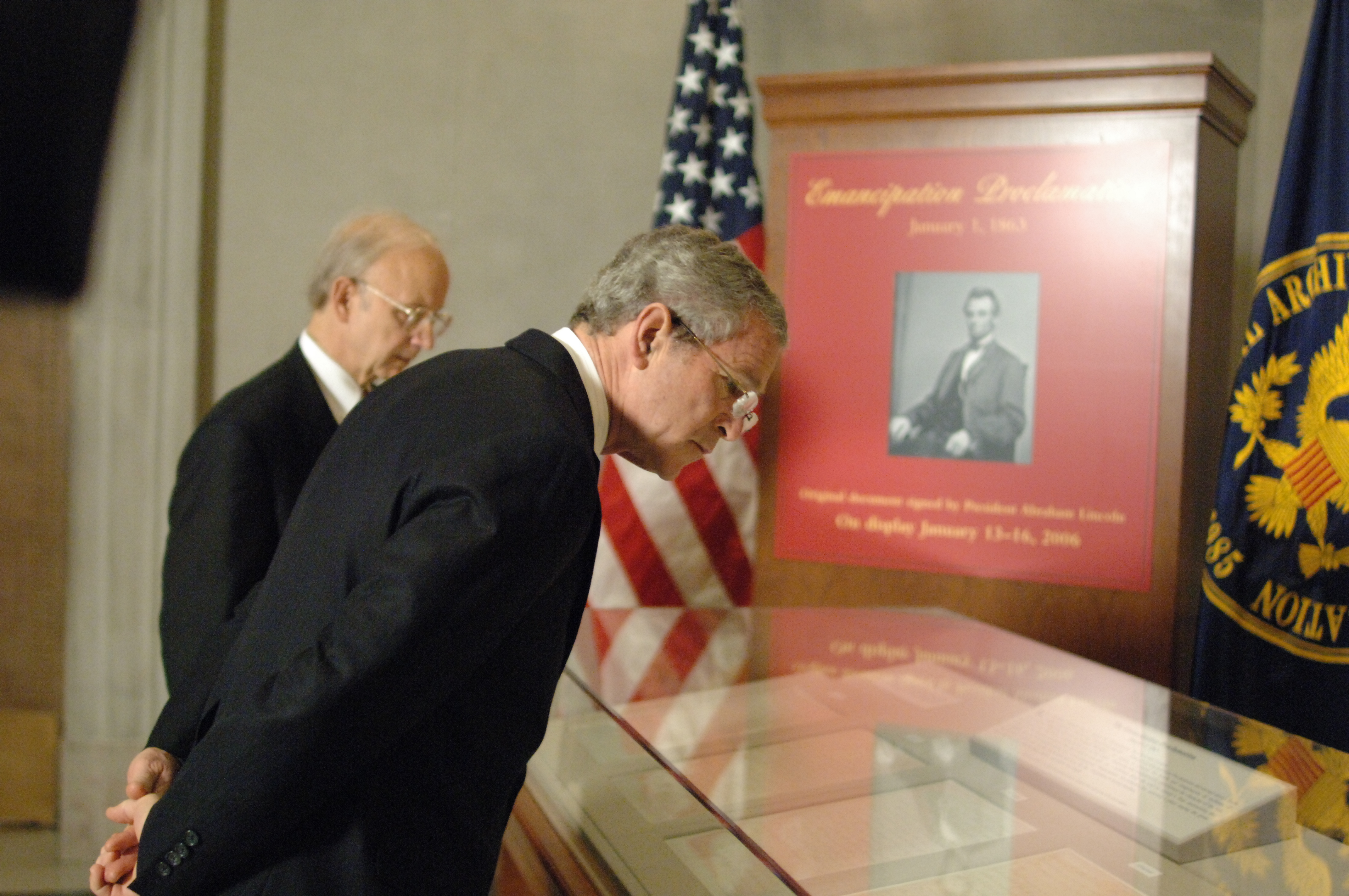 After seeing the Emancipation Proclamation, Bush commented, “It seems fitting on Martin Luther King Day that I come and look at the Emancipation Proclamation in its original form. Abraham Lincoln recognized that all men are created equal. Martin Luther King lived on that admonition to call our country to a higher calling, and today we celebrate the life of an American who called Americans to account when we didn’t live up to our ideals.”