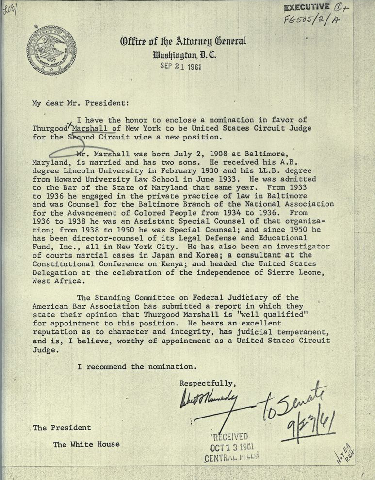 In 1961 President John F. Kennedy nominated Marshall to the U.S. Court of Appeals for the Second Circuit, a new position. Despite his immense qualifications, the confirmation was held up in the Senate, and Marshall served the first several months under a recess appointment.