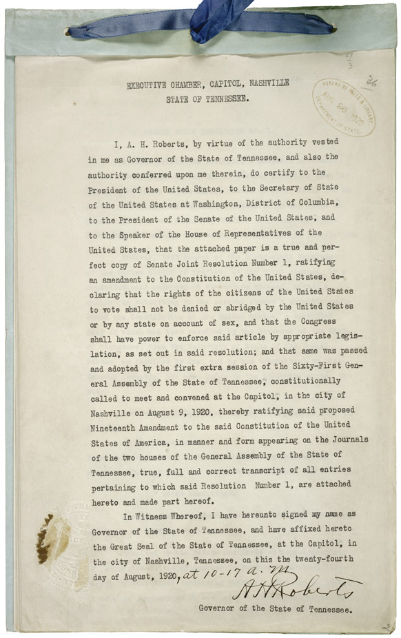 Tennessee Governor Albert H. Roberts sent notice of the ratification to Washington, DC, and on August 26, 1920, Secretary of State Bainbridge Colby certified the ratification of the 19th Amendment effective August 18, 1920.