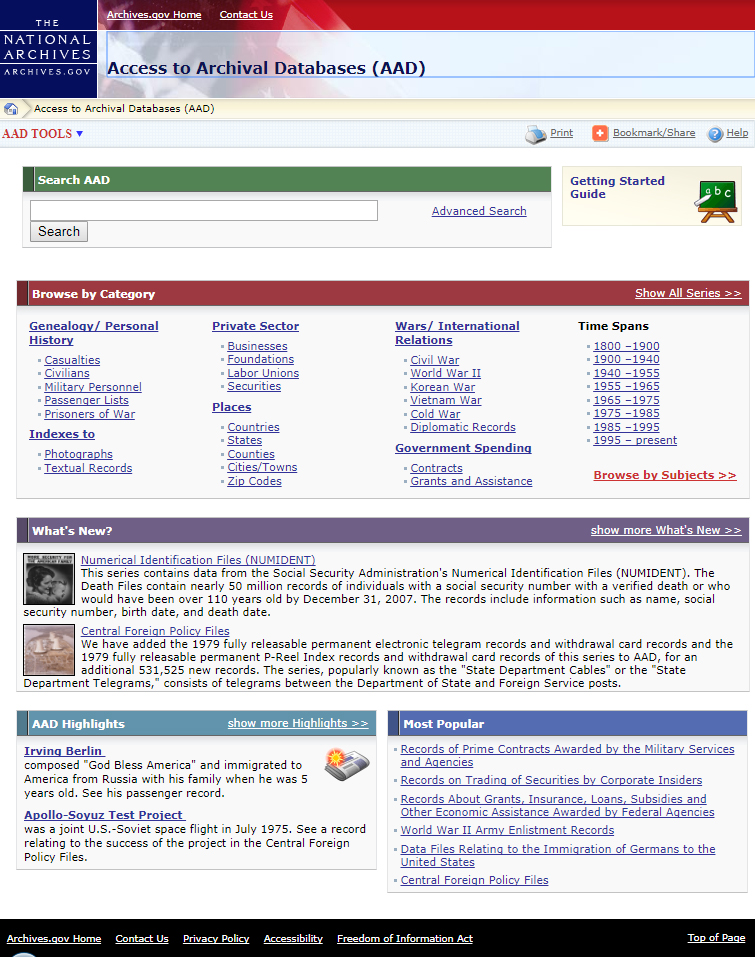 NARA’s Access to Archival Databases—the first stop for many electronic records researchers. (https://aad.archives.gov/aad/)