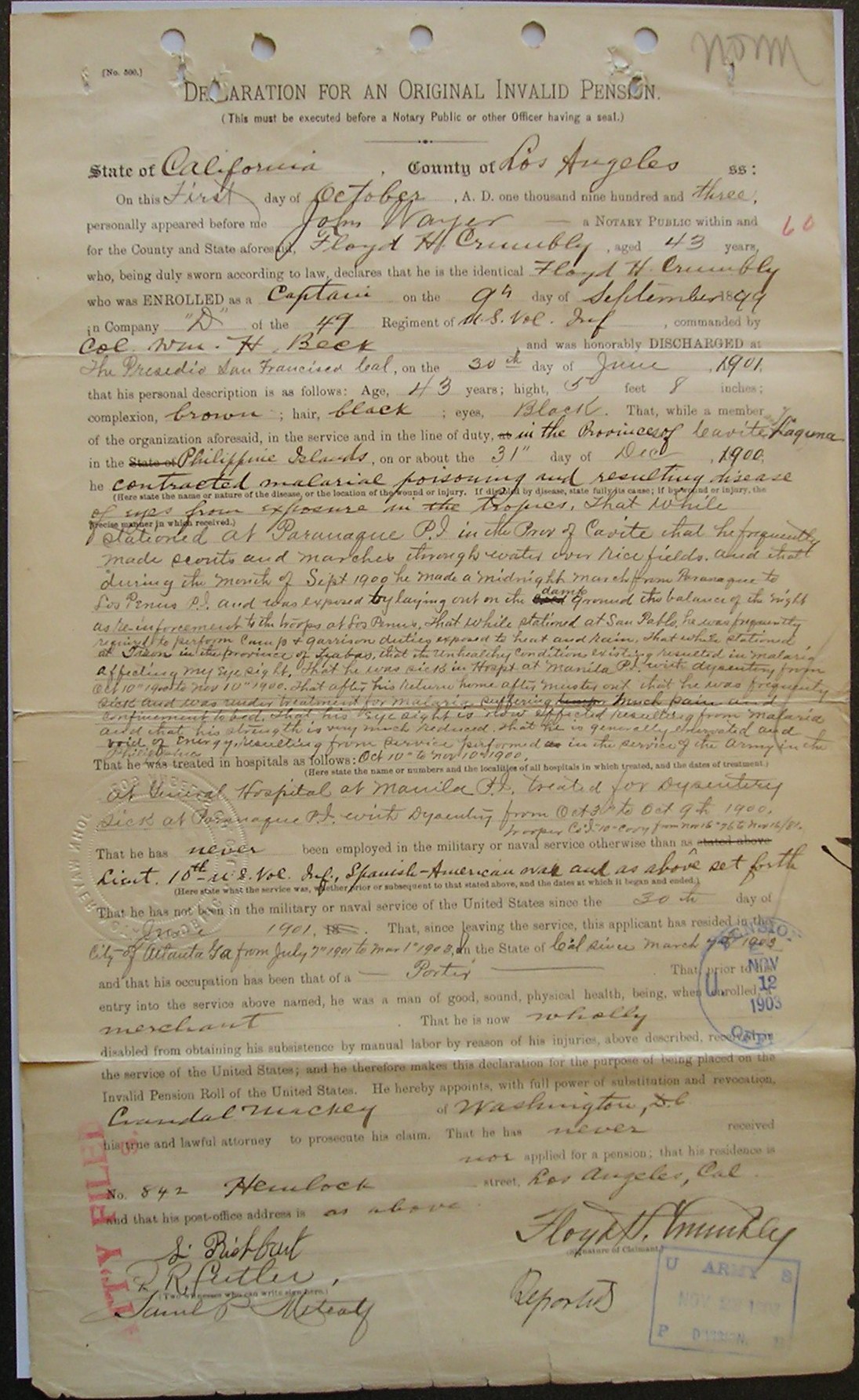 His service to our nation took its toll on Crumbly’s health. He suffered from the effects of malaria and had difficulty obtaining a pension. Yet, even with his health problems, Crumbly continued his civic involvement in Los Angeles, and when war loomed in 1916 and 1917, and despite his advanced age, volunteered for whatever he could to serve our nation once again.