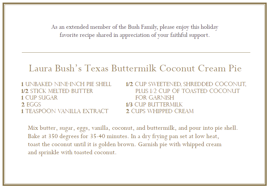 Buttermilk. Coconut. Cream. Pie. Someone please bake this and report back if it is as delicious as First Lady Laura Bush makes it sound.