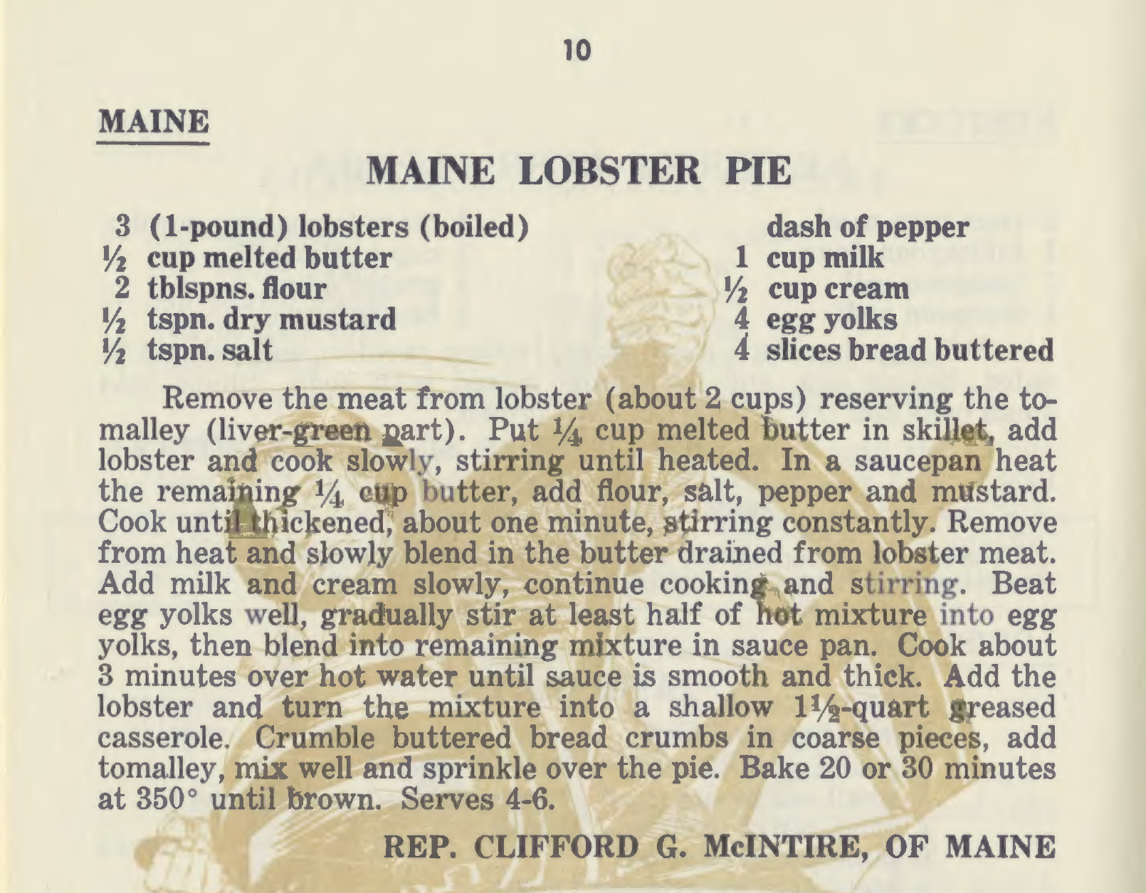 What to do if you have a paucity of apples but an abundance of lobster? Make this Maine Lobster Pie, of course! The recipe is from the 1962 Republican Congressional Cookbook, but we promise that the toothsome crustacean appeals to taste buds of all political stripes.