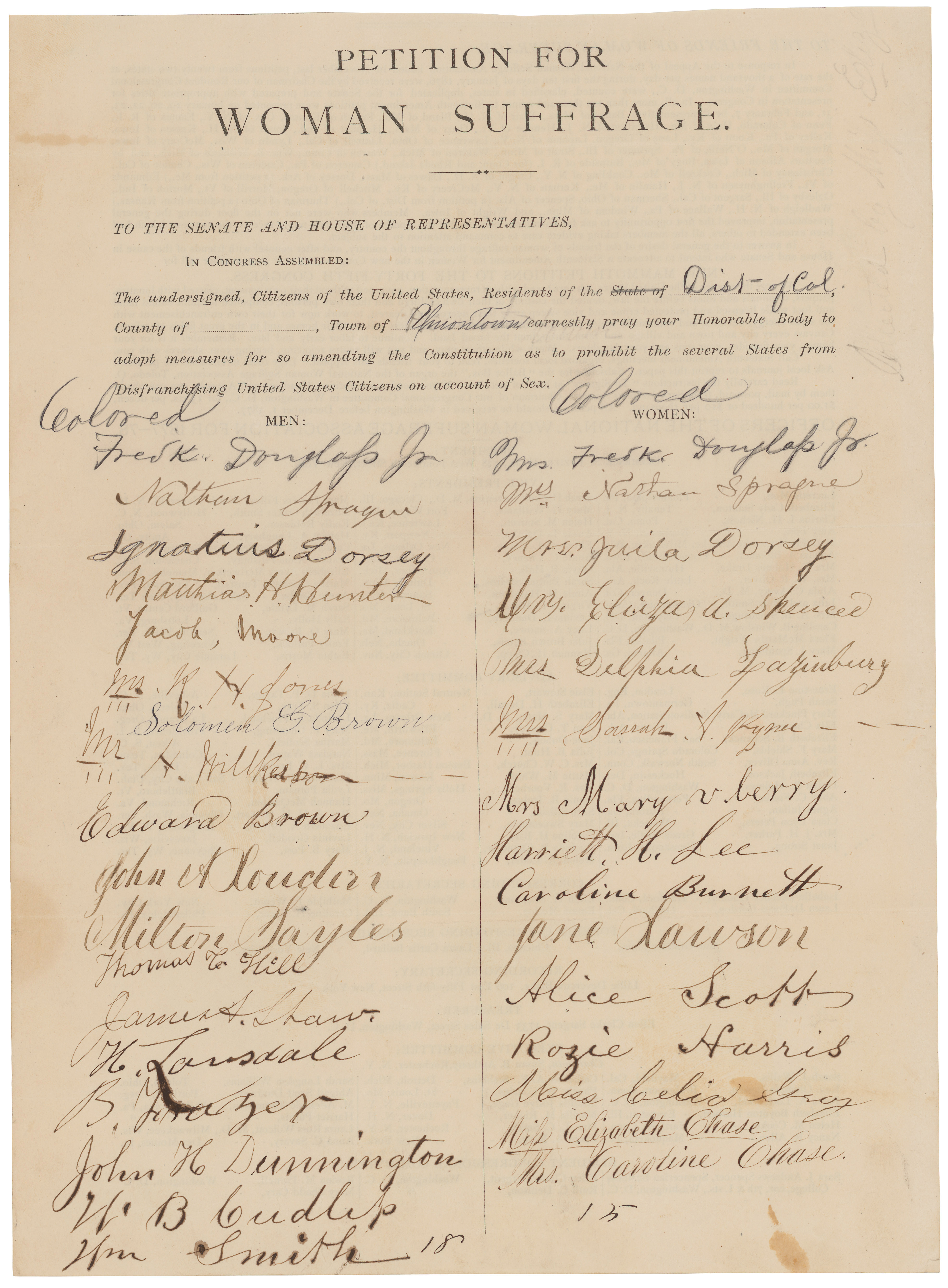 Support for the National Woman Suffrage Association continuously grew, and as petitions circulated, the signatures of black Americans were not left off. Among the signatures on the petition for woman suffrage were Frederick Douglass’s son and daughter.