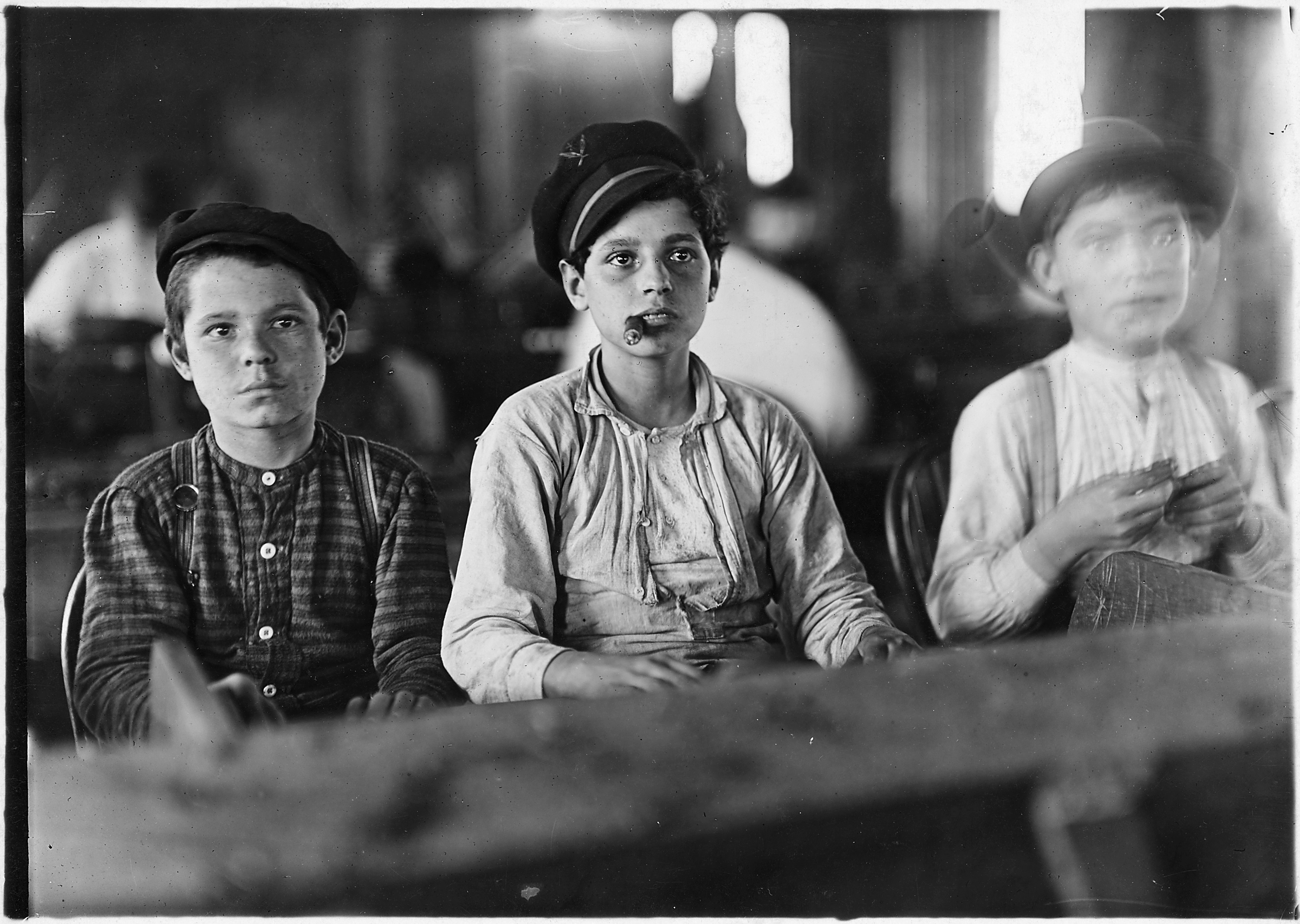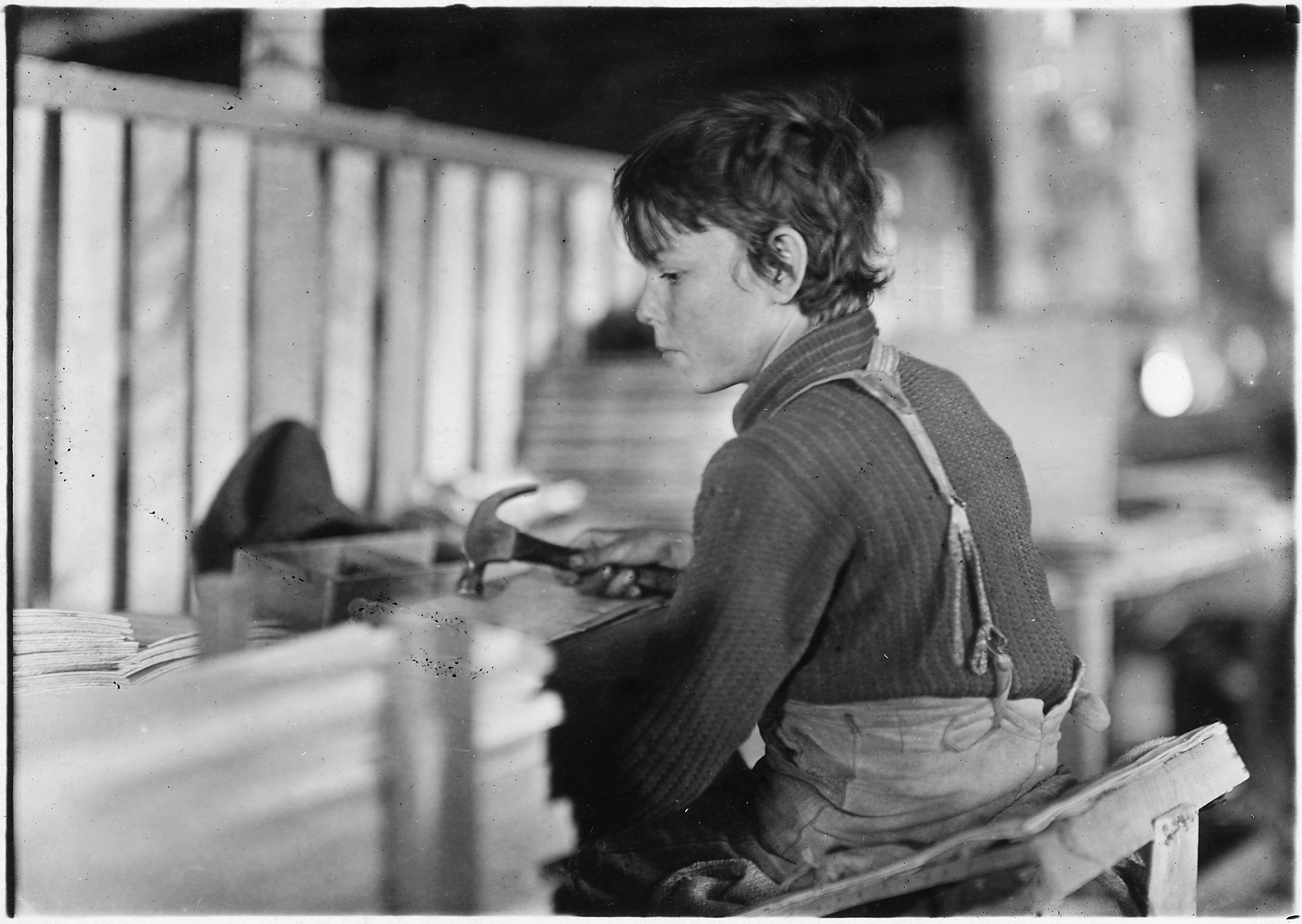 Hine once observed that he had to photograph child workers in the absence of their supervisors, who refused permission to have photos taken so as to not stir up child labor agitation. In his photograph captions, Hine often mentioned the conditions of the children’s workplaces and pointed out the risks children had to take in their work where they were not obvious.