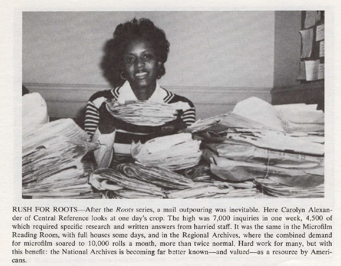 The increased interest resulted in an unprecedented demand for our resources. In 1977, the Microfilm Reading Room in National Archives Building in Washington, DC, had wait lines for the first time in our history. And the volume of reference letters increased exponentially, with a high of 7,000 letters in just one week!