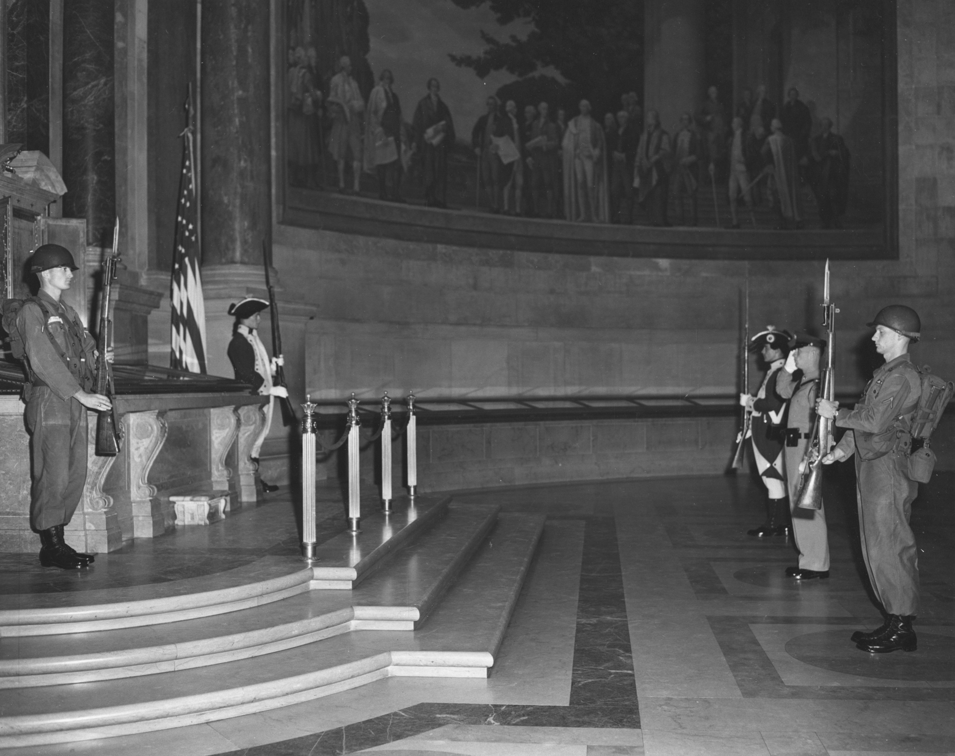 The changing of the guard was adopted from the procedure then used at the Tomb of the Unknown Soldier (there was only one unknown then). Every 15 minutes the NCO on duty would move to the center between the big wrought-iron gates and nod; this was our signal to change position. Some of the visitors standing nearby could be a bit startled by our abrupt moves.