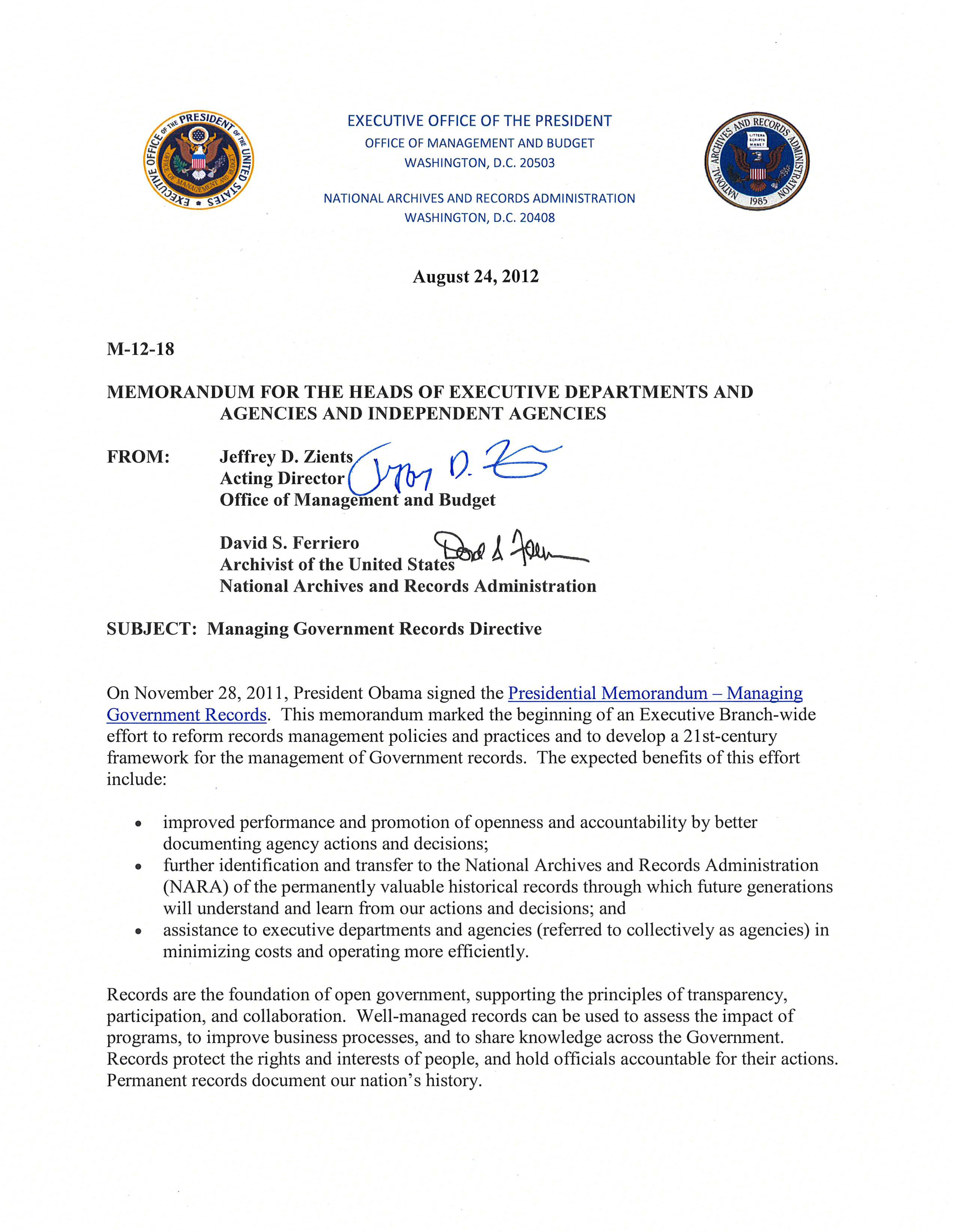 After President Barack Obama issued the Presidential Memorandum on Managing Government Records, NARA and the Office of Management and Budget jointly issued the Managing Government Records Directive, setting a series of goals for NARA and agencies to support this transition. The keystone goals were for all agencies to be managing their email records electronically (no more printing email messages) by the end of 2016, and for all agencies to be managing all the permanent electronic records electronically by the end of 2019 (no more printing records that are born electronic).