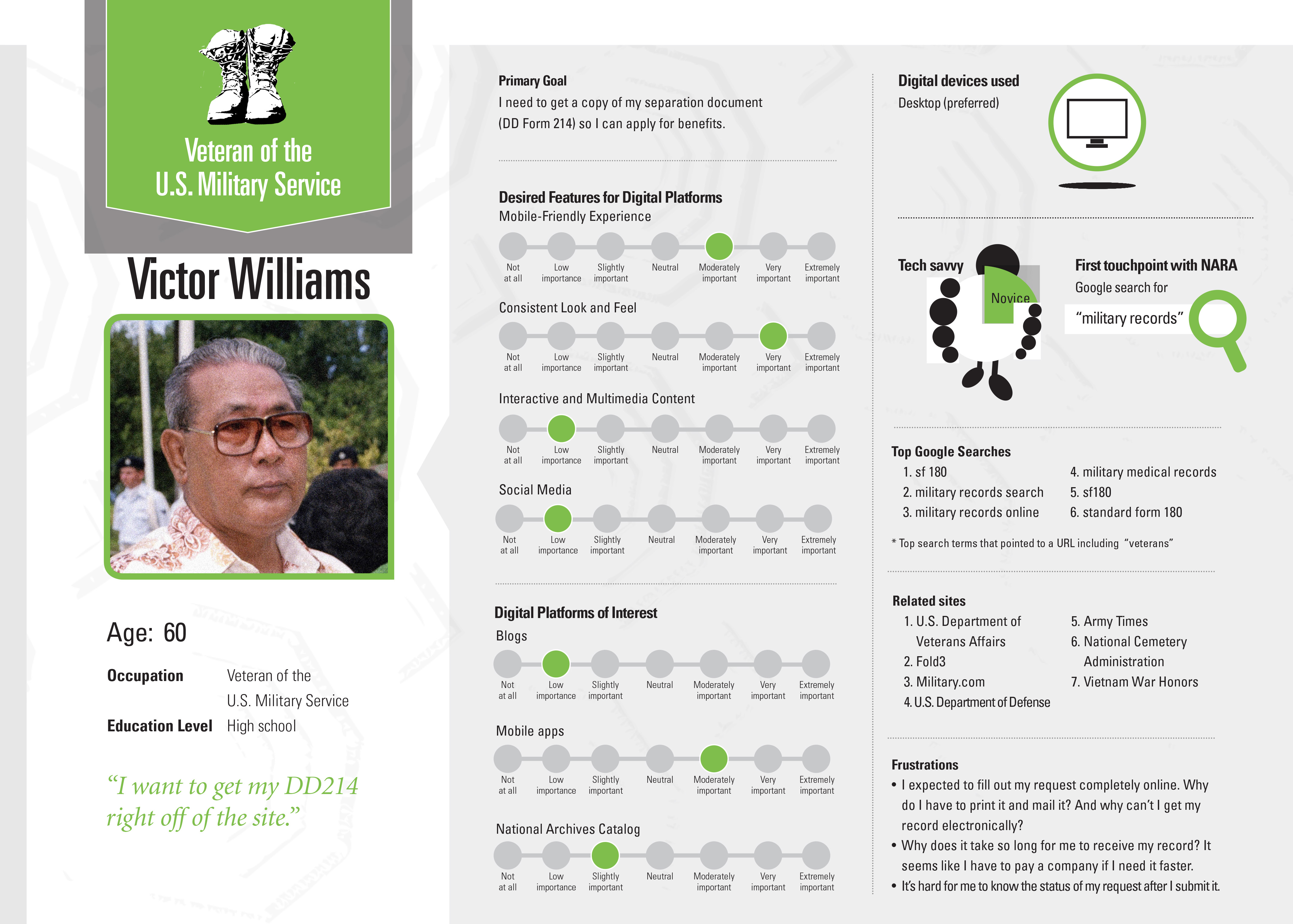 NARA has used digital user personas to help center the user experience of our website, Archives.gov. The Archivist of the United States, David Ferriero, has blogged about this work in “Improving Customer Experience with Digital Personas.” This work is ongoing and is being expanded by our new user experience (UX) team.