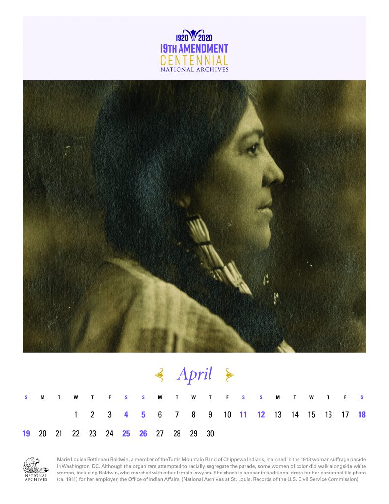 The 19th Amendment was ratified in 1920, but this landmark event was neither the beginning nor the end of the story for women and their struggle for the right to vote. Join us in 2020 as we commemorate this centennial year with 12 stories from our holdings for you to save, print, or share. April’s featured image is of Marie Louise Bottineau Baldwin.