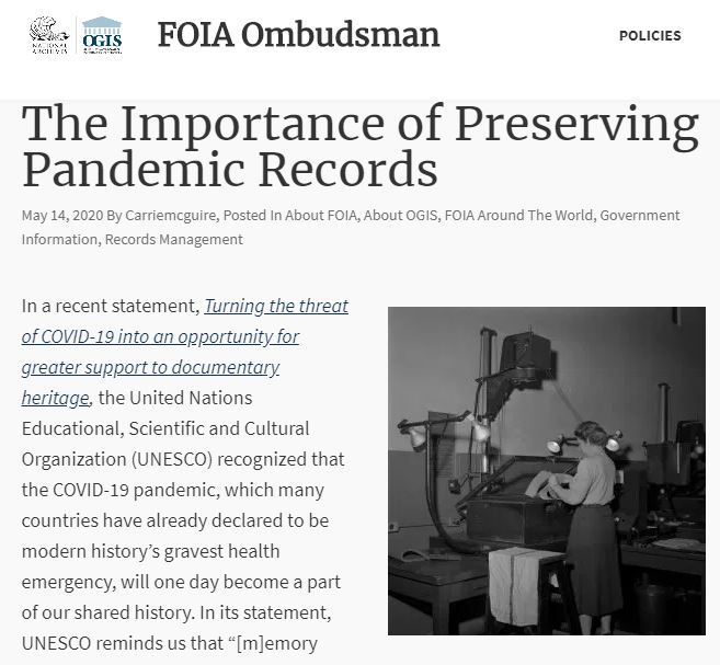 The Office of Government Information Services (OGIS), the government’s Freedom of Information Act ombudsman’s office and a component of NARA, wrote an excellent blog post calling attention to this statement, an earlier UNESCO statement, and the International Conference of Information Commissioners’ involvement in it: The Importance of Preserving Pandemic Records.