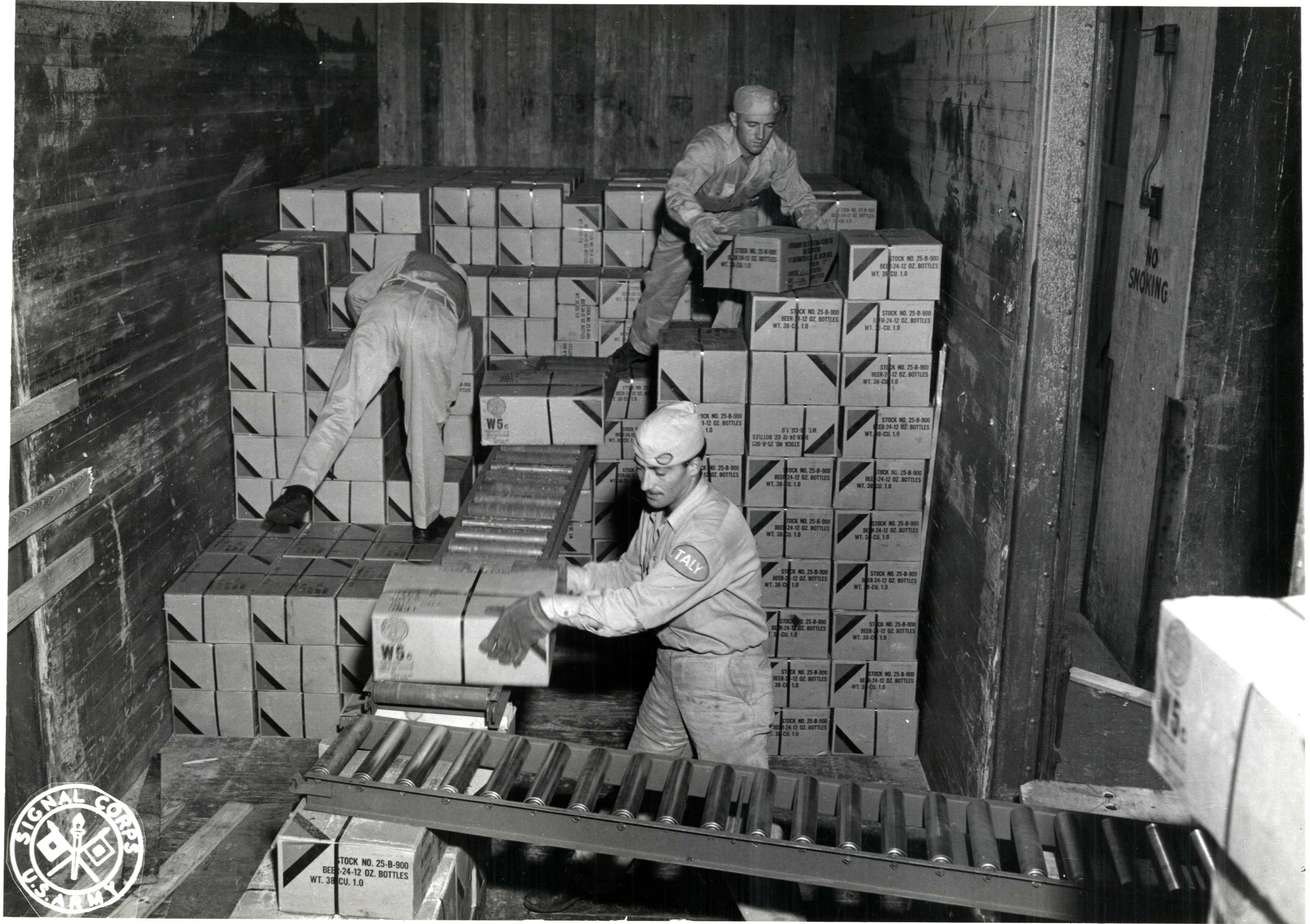 Italian Service Unit receiving supply of beer via railroad car, Boston Port of Embarkation, South Boston, Massachusetts. (National Archives Identifier 6524096)