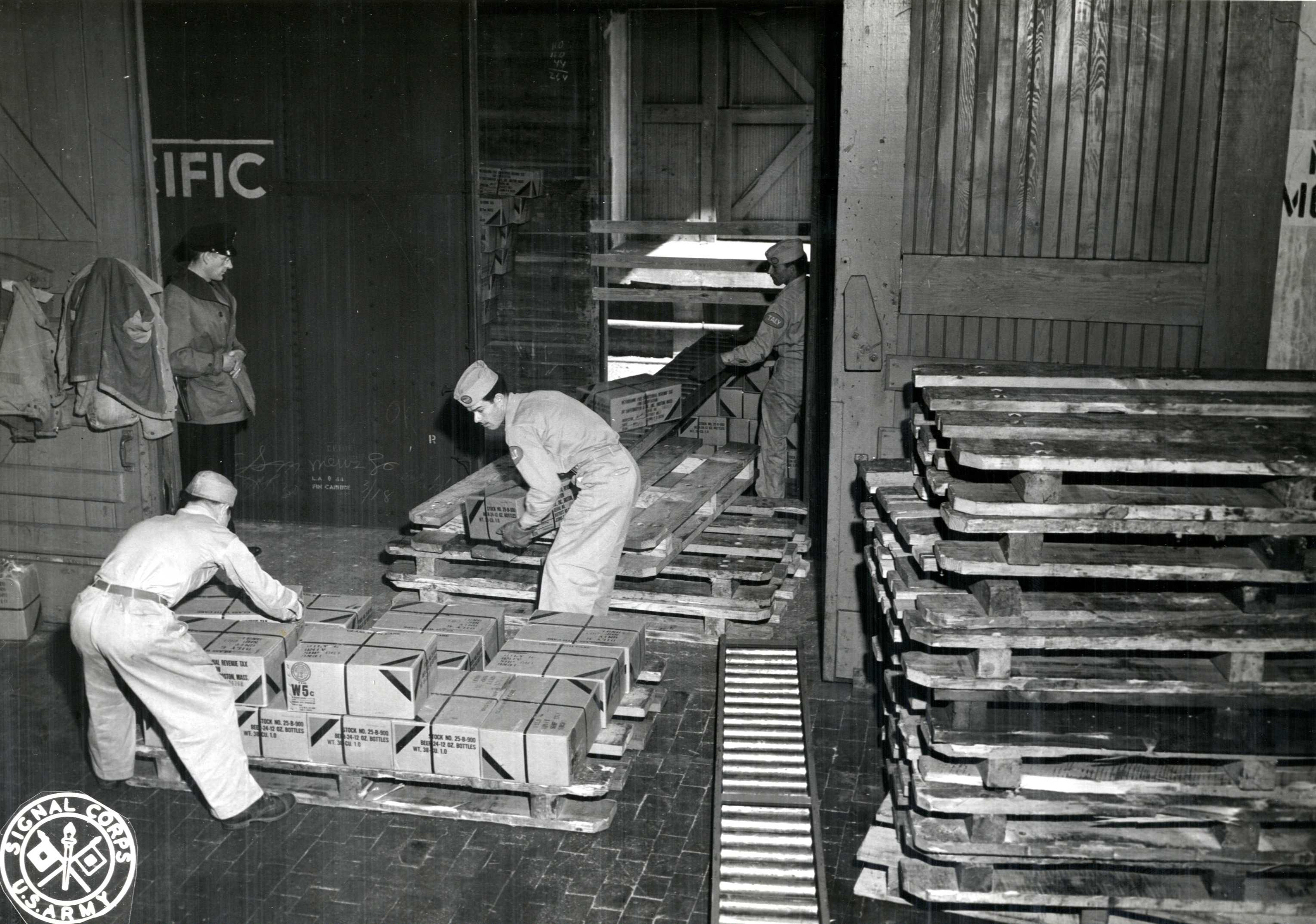 Italian Service Unit palletizing a supply of beer being unloaded from a railroad car at the Boston Port of Embarkation. South Boston, Massachusetts, Marine guard stand watch. (National Archives Identifier 6524098)