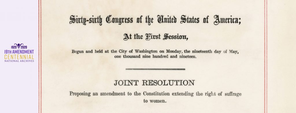 The 19th Amendment was ratified in 1920, but this landmark event was neither the beginning nor the end of the story for women and their struggle for the right to vote. Join us as we commemorate the centennial year of 2020 with 12 stories from our holdings for you to save, print, or share. August’s featured image is the Joint Resolution Proposing the 19th Amendment to the Constitution.