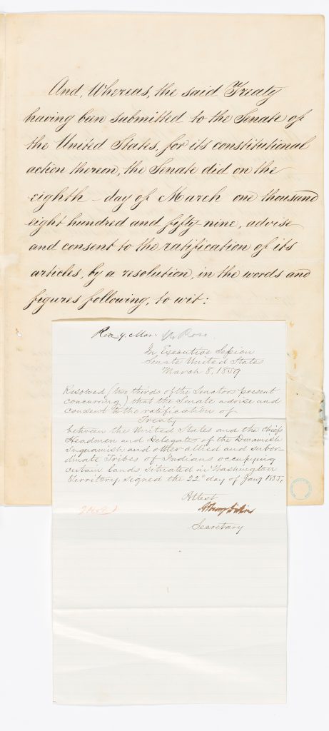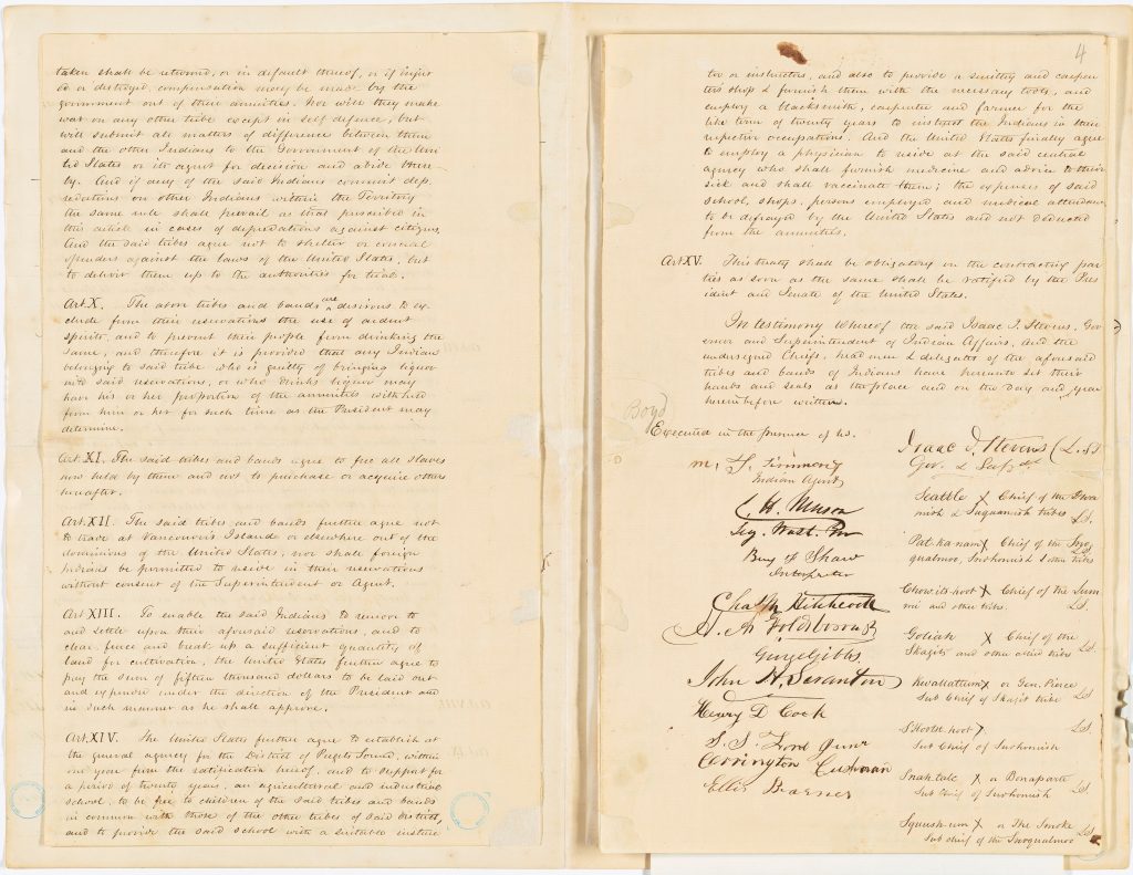 The signed treaty agreement ceded millions of acres of land to the United States Government in exchange for protected reservation land, a hospital, a school, and the reserved rights to continue to hunt, fish, and gather in the ancestral lands. The tribal leaders of the allied bands and tribes drew the letter “X” as their signature. Once the signatures and marks were all in place, the Point Elliott Treaty was born. It was created from parchment paper and ink signatures of the governor, other government officials, and several chiefs and sub-chiefs, written on both the front and back of a half-dozen documents.