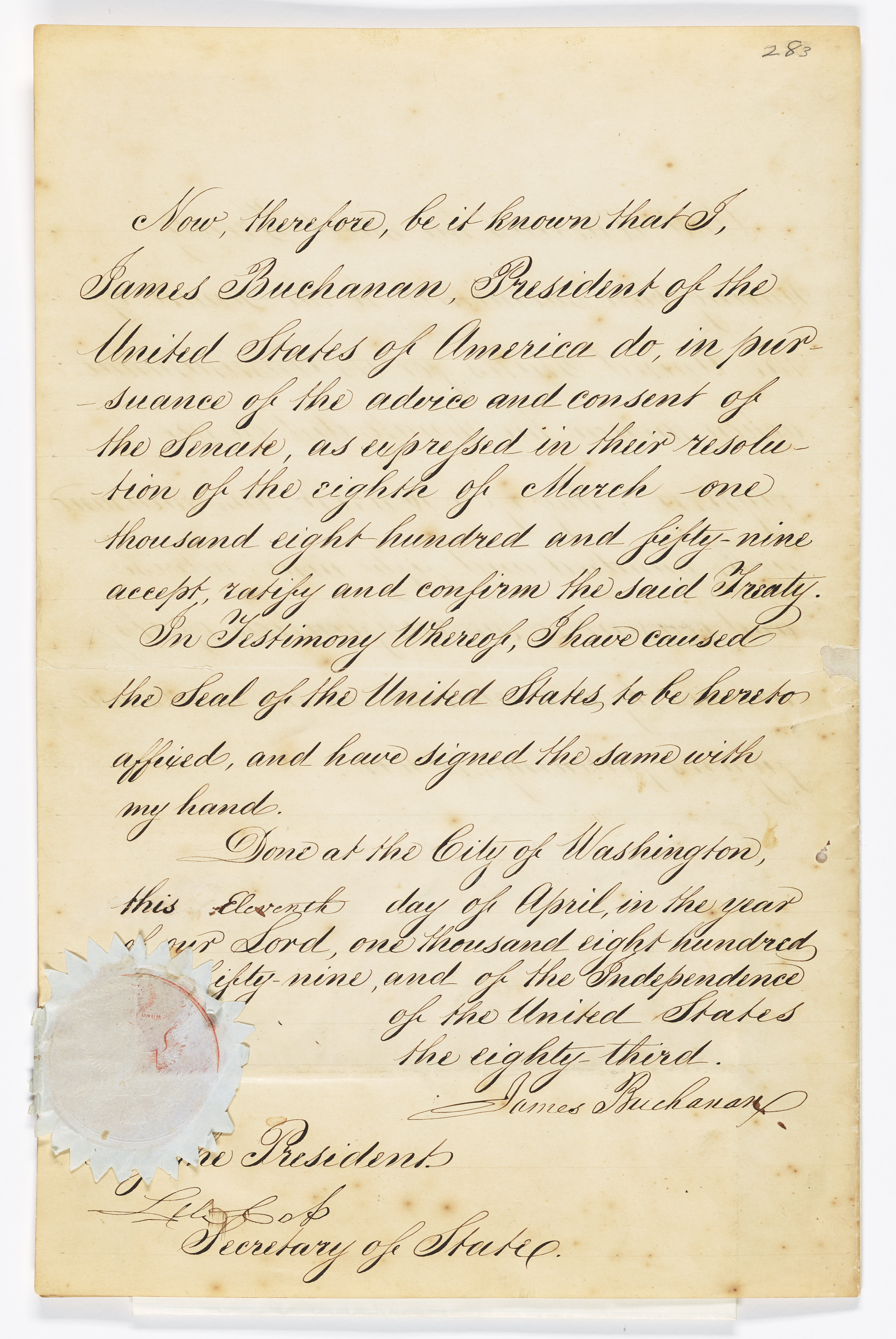 Next, according to the National Archives’ documented history, the U.S. Senate ratified the treaty on March 8, 1859. A State Department clerk then prepared the handwritten document for the President’s signature. The signature process was witnessed by the Secretary of State, who then he signed it himself, and the Great Seal was applied to the final document. President James Buchanan then proclaimed the treaty on April 11, 1859, and the original document was returned to the State Department, where it was housed in a building on the north side of Lafayette Square across from the White House.
