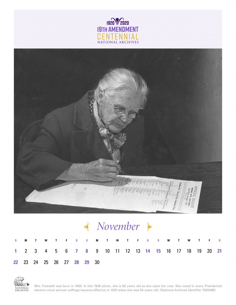 The 19th Amendment was ratified in 1920, but this landmark event was neither the beginning nor the end of the story for women and their struggle for the right to vote. Join us in 2020 as we commemorate this centennial year with 12 stories from our holdings for you to save, print, or share. November’s featured image is of Mrs. Fresdahl of South Dakota.