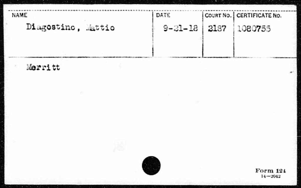 Not all of the naturalizations referenced in this index are held by the National Archives. For example, the index card of Mattio Diagostino, seen below, lists Camp Merritt as the military base, 9/21/1918 as the date of naturalization, 1080755 as the certificate number, and the court number as 2178.