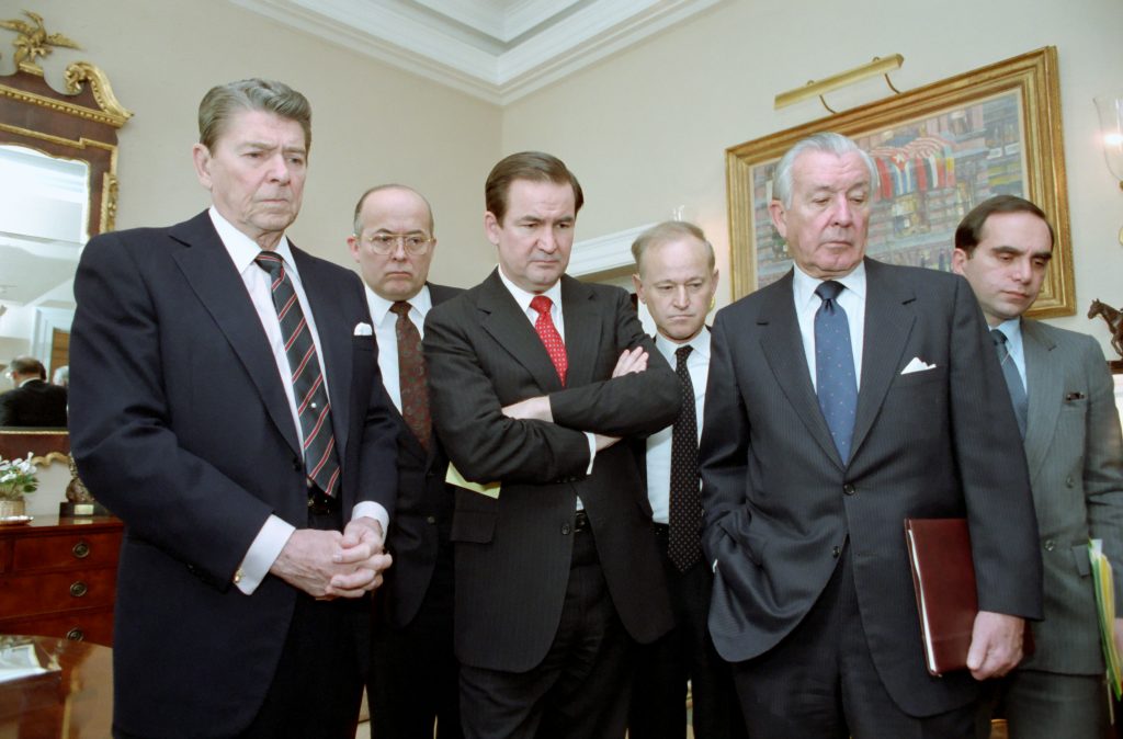 President Ronald Reagan in the Oval Office study watches a television replay of the Space Shuttle “Challenger” explosion with Don Regan, Pat Buchanan, Al Kingon, and Edward Djerejian, 1/28/1986. (National Archives Identifier 75854573)