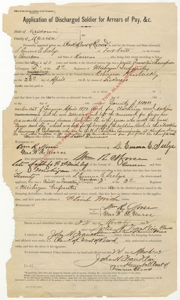 Sarah Emma Edmonds Seelye pension application, 1882. (National Archives Identifier 306649)